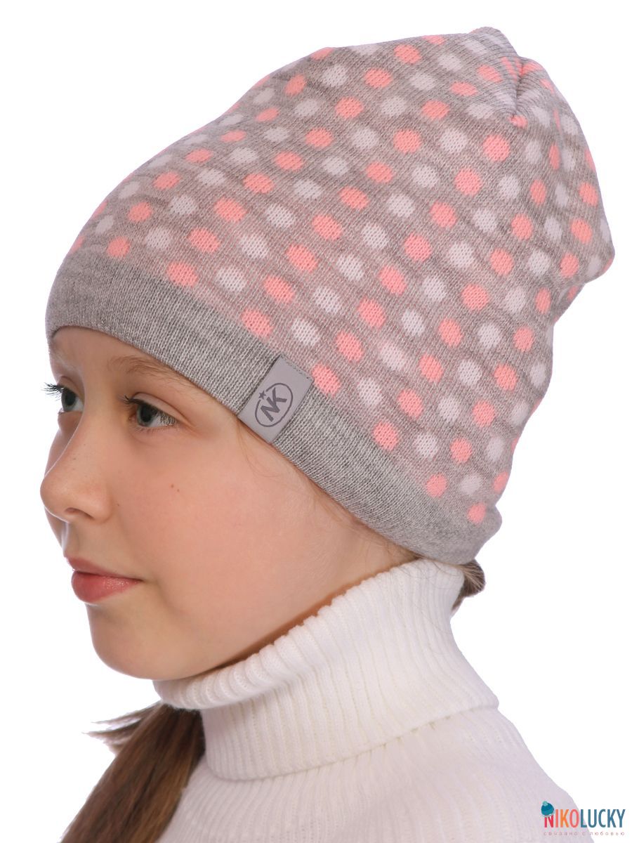 Шапка двойная для девочки сезона осень-весна с цветным рисунком в виде горошка.
