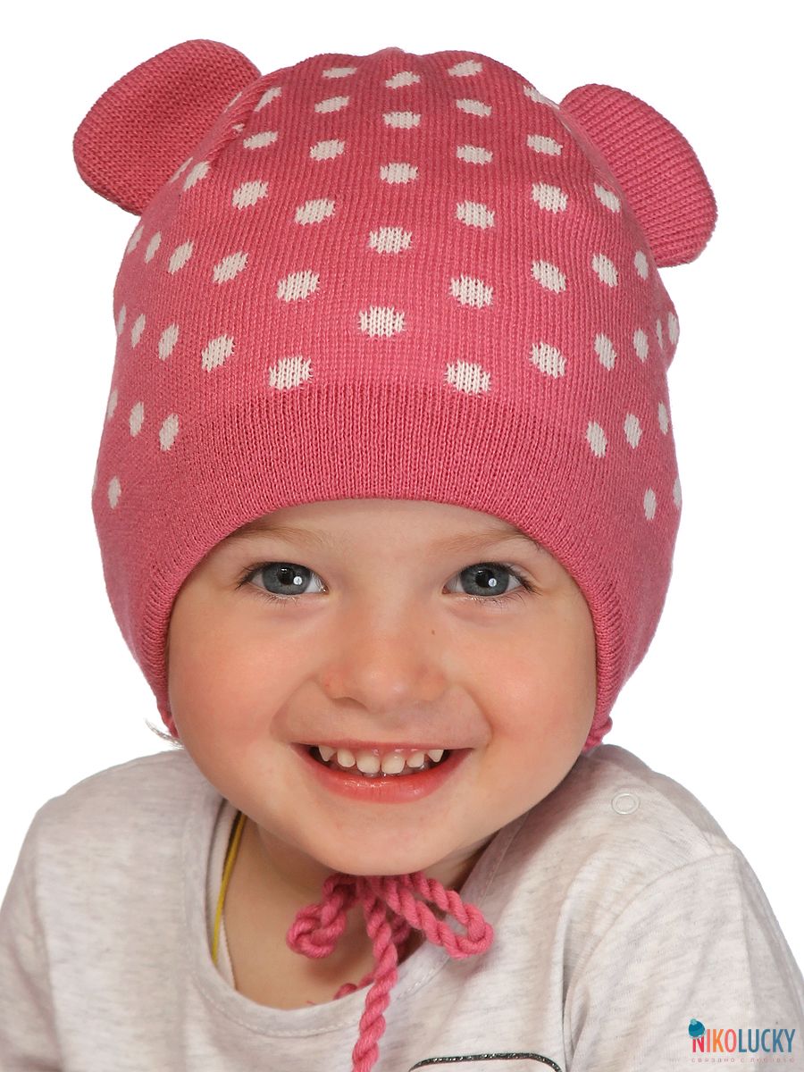 Шапка двойная для девочки с вывязаным рисунком в виде горошка и забавными ушками.