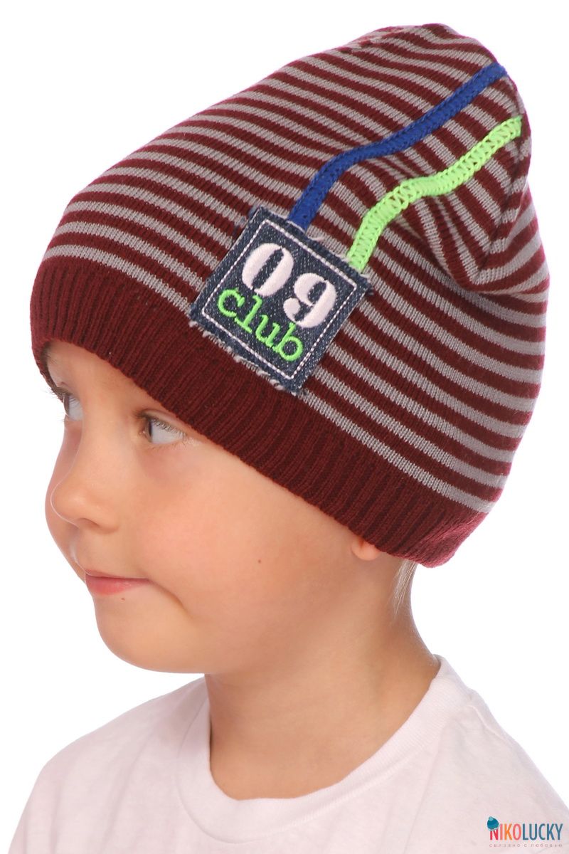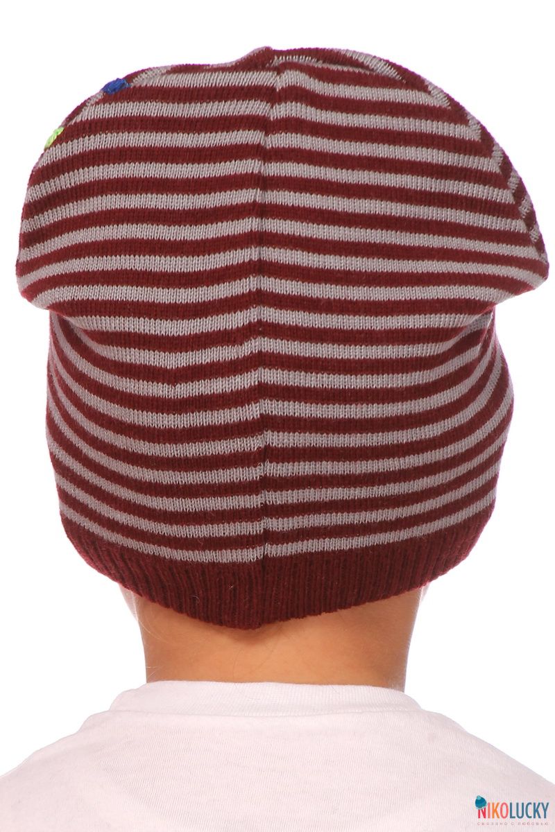 Шапка двойная для мальчика с рисунком в виде полос и цветной нашивкой.