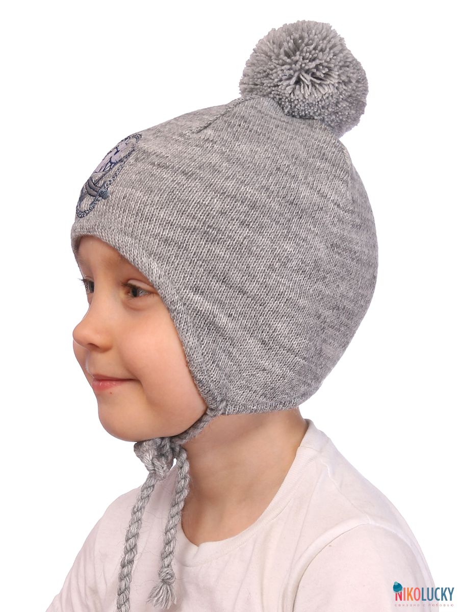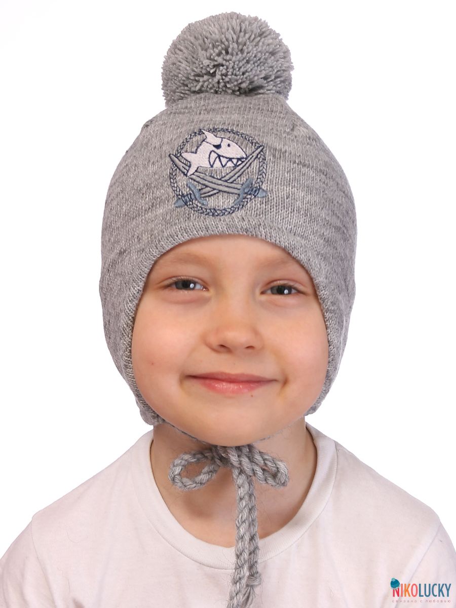 Шапка двойная для мальчика с помпоном, на завязках и вышивкой в виде акулы.