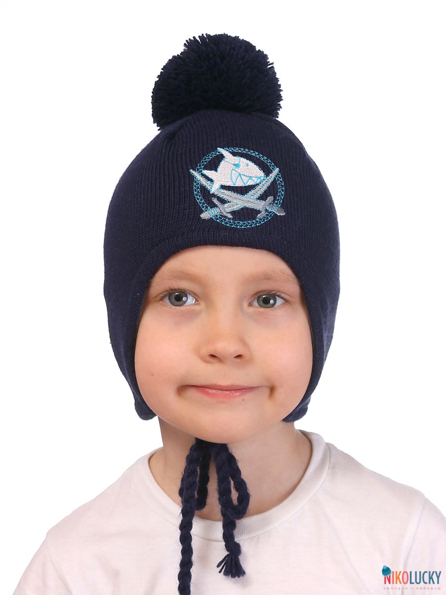 Шапка двойная для мальчика с помпоном, на завязках и вышивкой в виде акулы.
