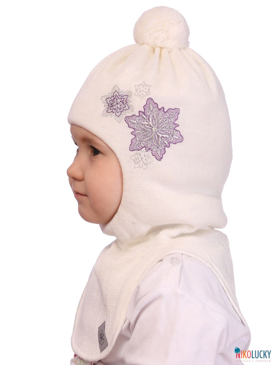 Шлем сбоку украшен вышитыми сиренево-серебряневыми снежинками.