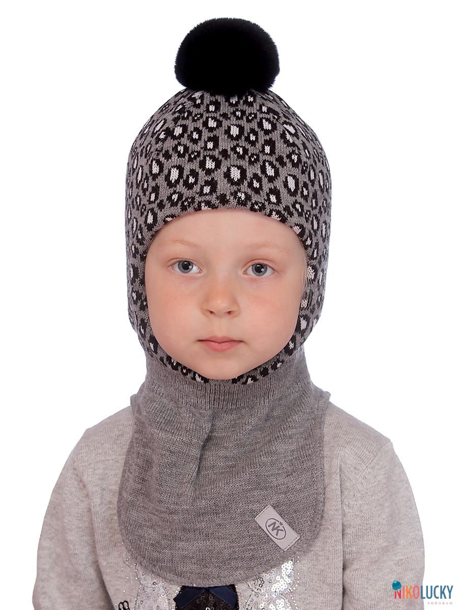 Шапка-шлем двойной, зимний для девочки с цветным, ярким леопардовым рисунком и помпоном из натурального меха кролика " рекс".