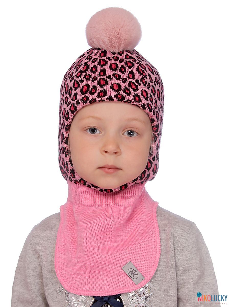 Шапка-шлем двойной, зимний для девочки с цветным, ярким леопардовым рисунком и помпоном из натурального меха кролика " рекс".
