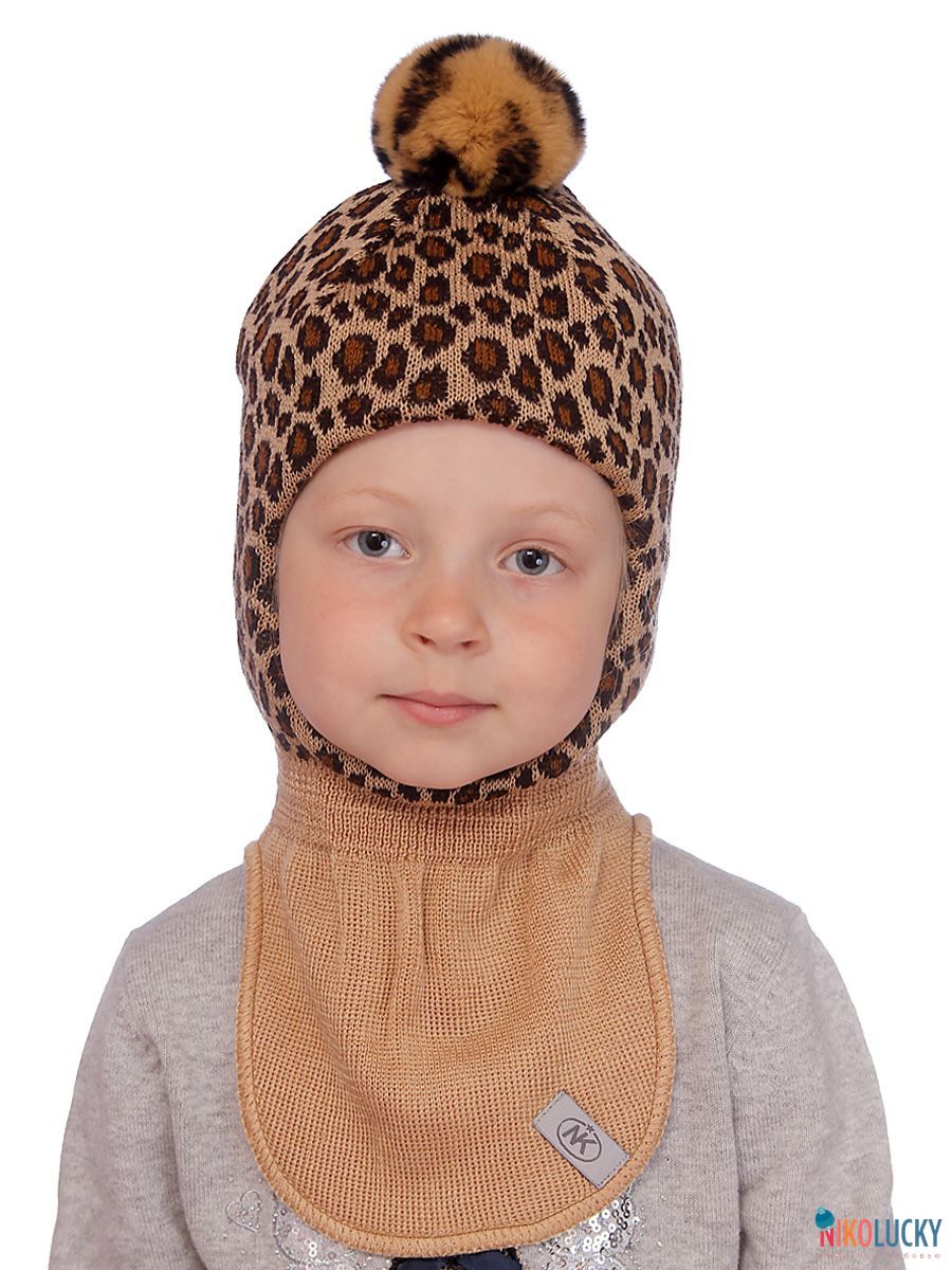 Шапка-шлем двойной, зимний для девочки с цветным, ярким леопардовым рисунком и помпоном из натурального меха кролика " рекс".