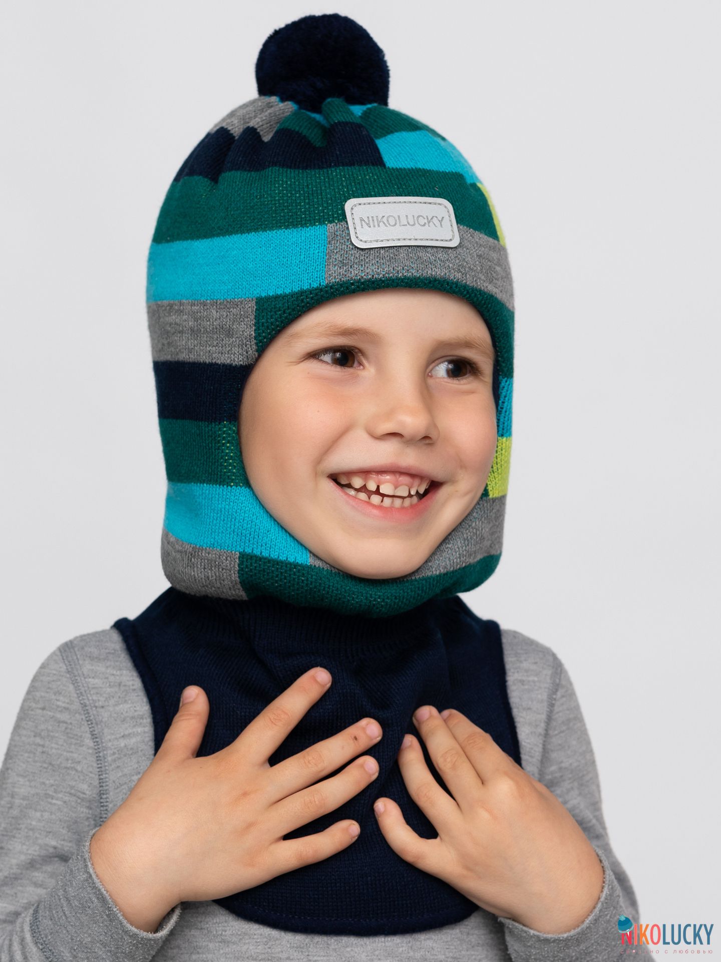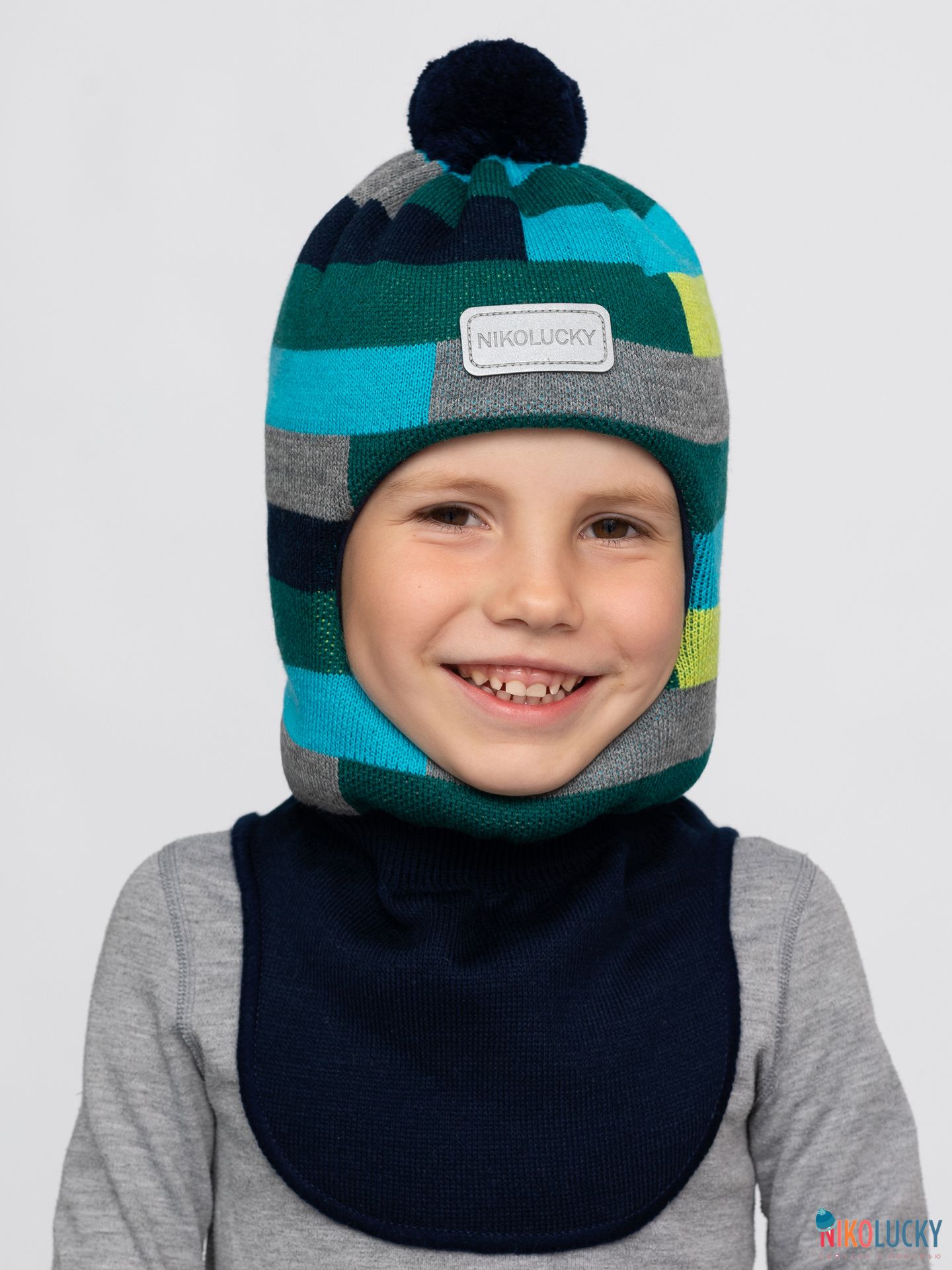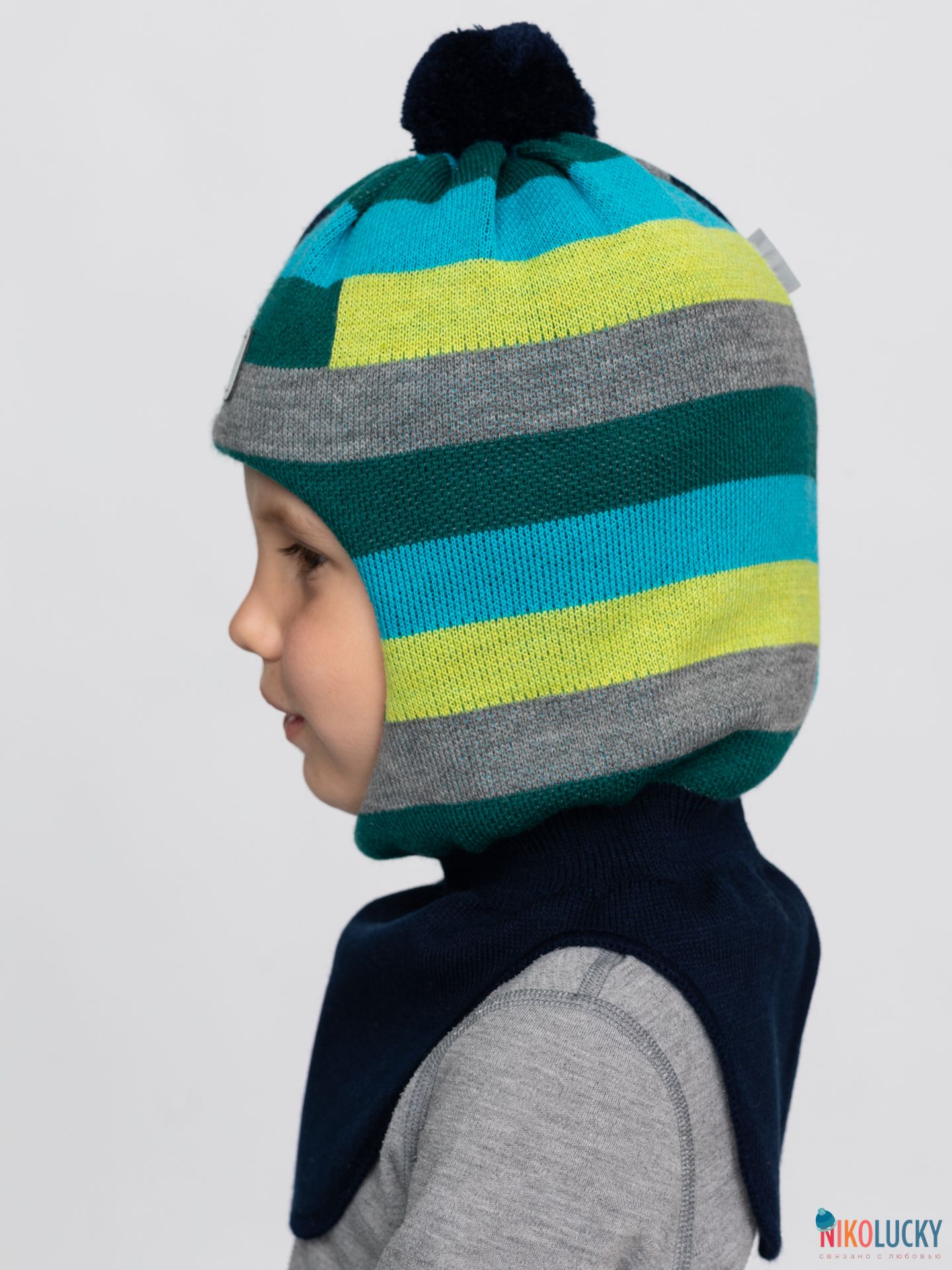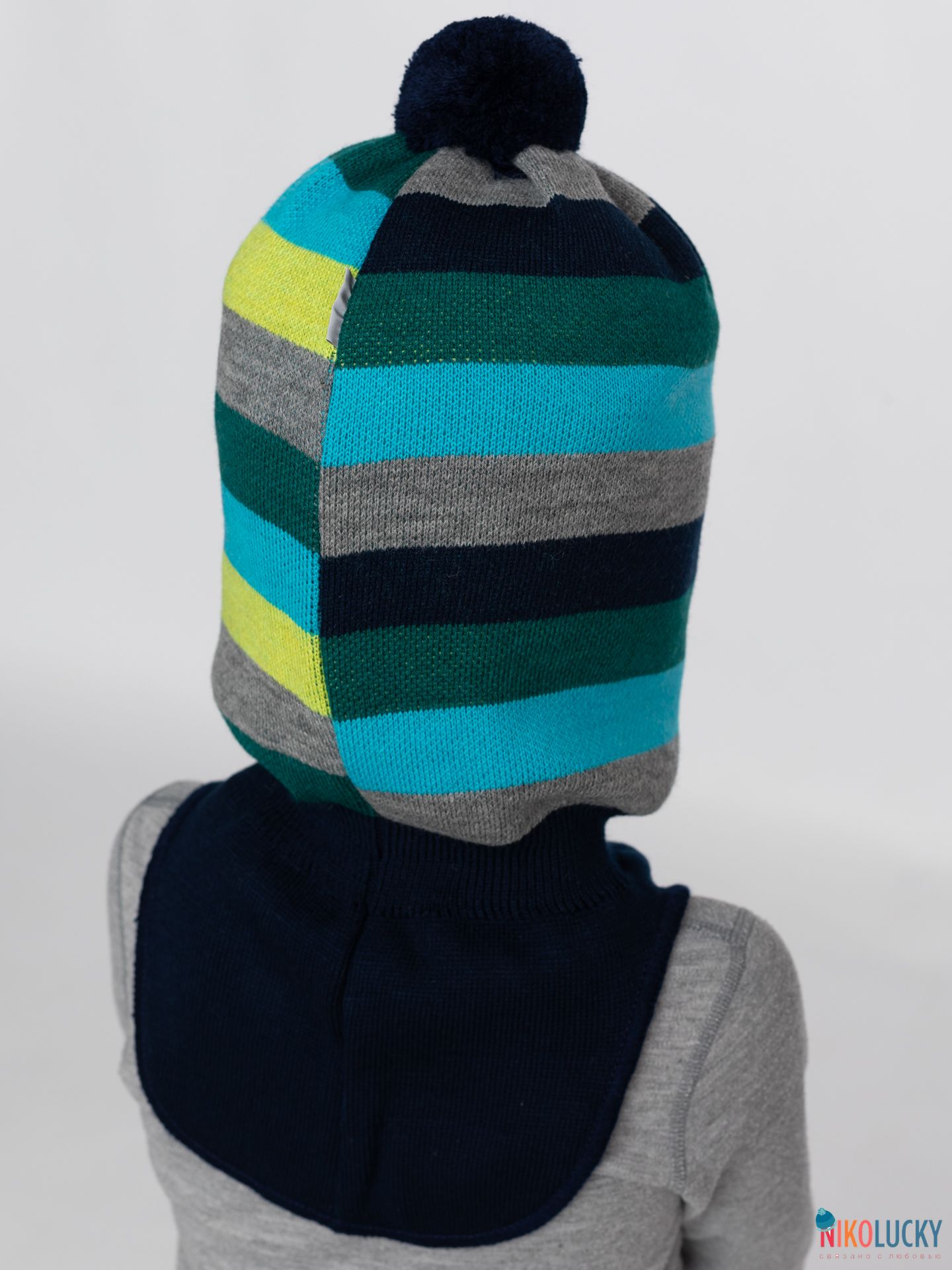 Шапка шлем для мальчика с трикотажным помпоном и вывязанным геометрическим разноцветным рисунком.