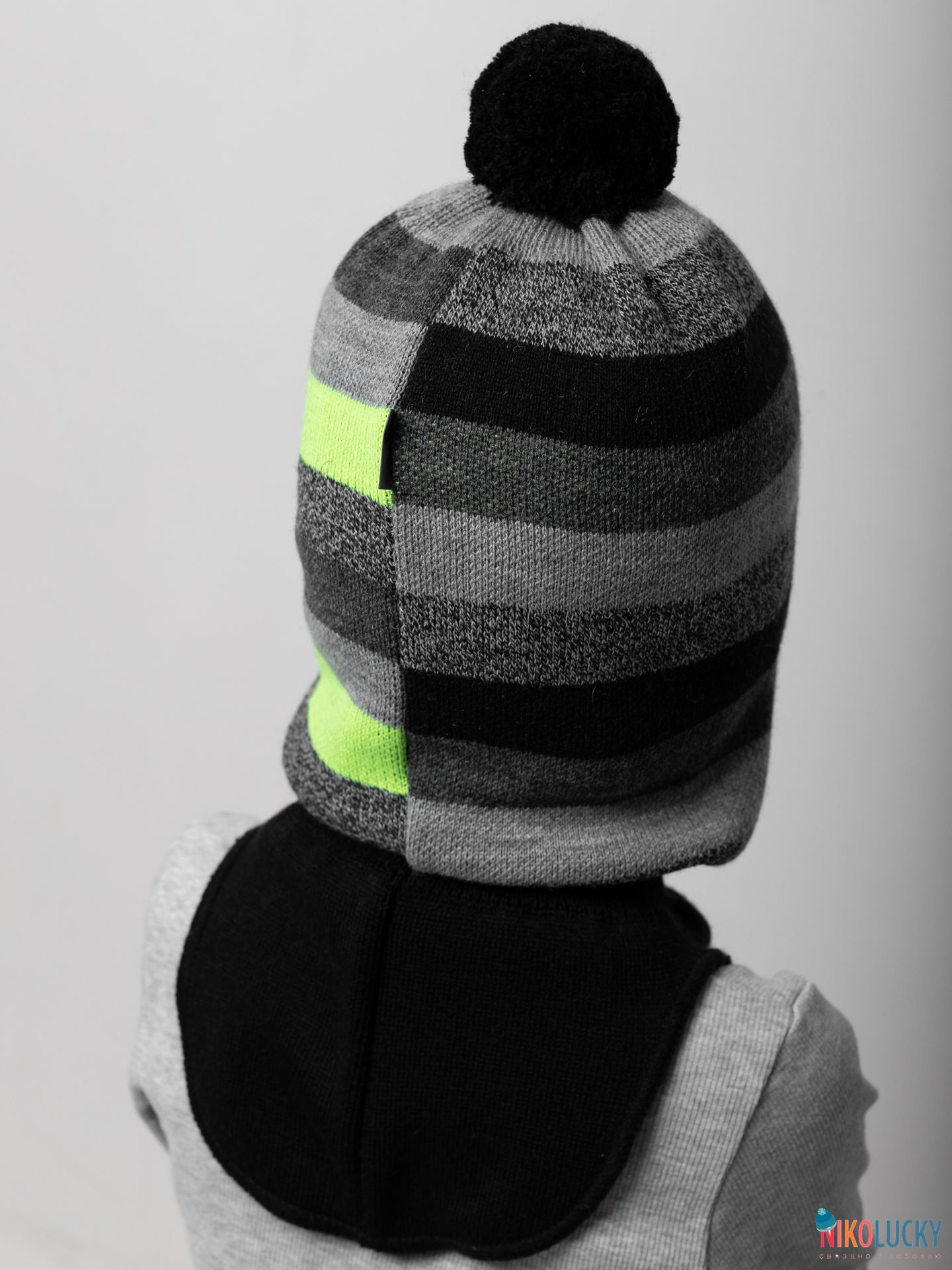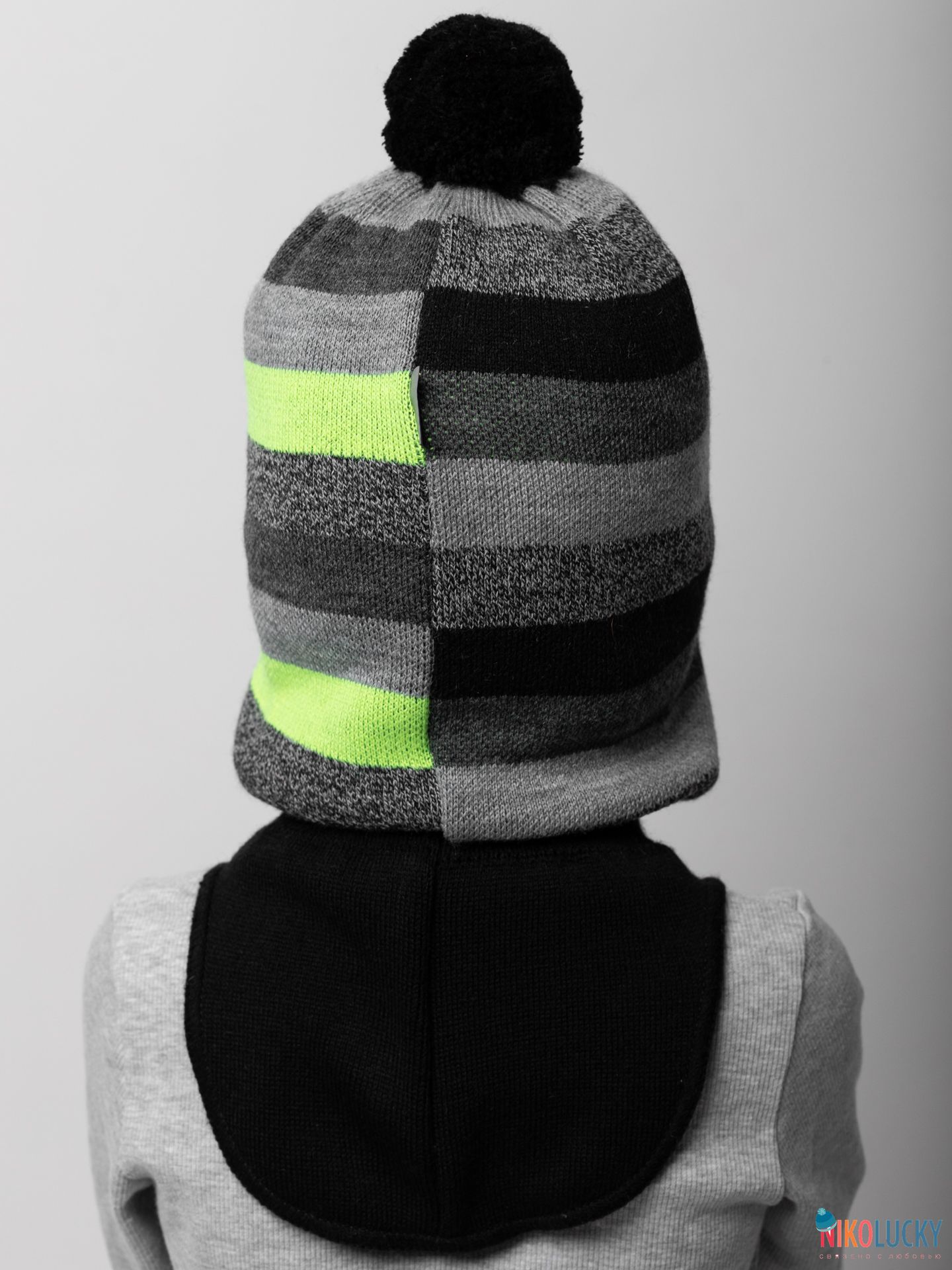 Шапка шлем для мальчика с трикотажным помпоном и вывязанным геометрическим разноцветным рисунком.
