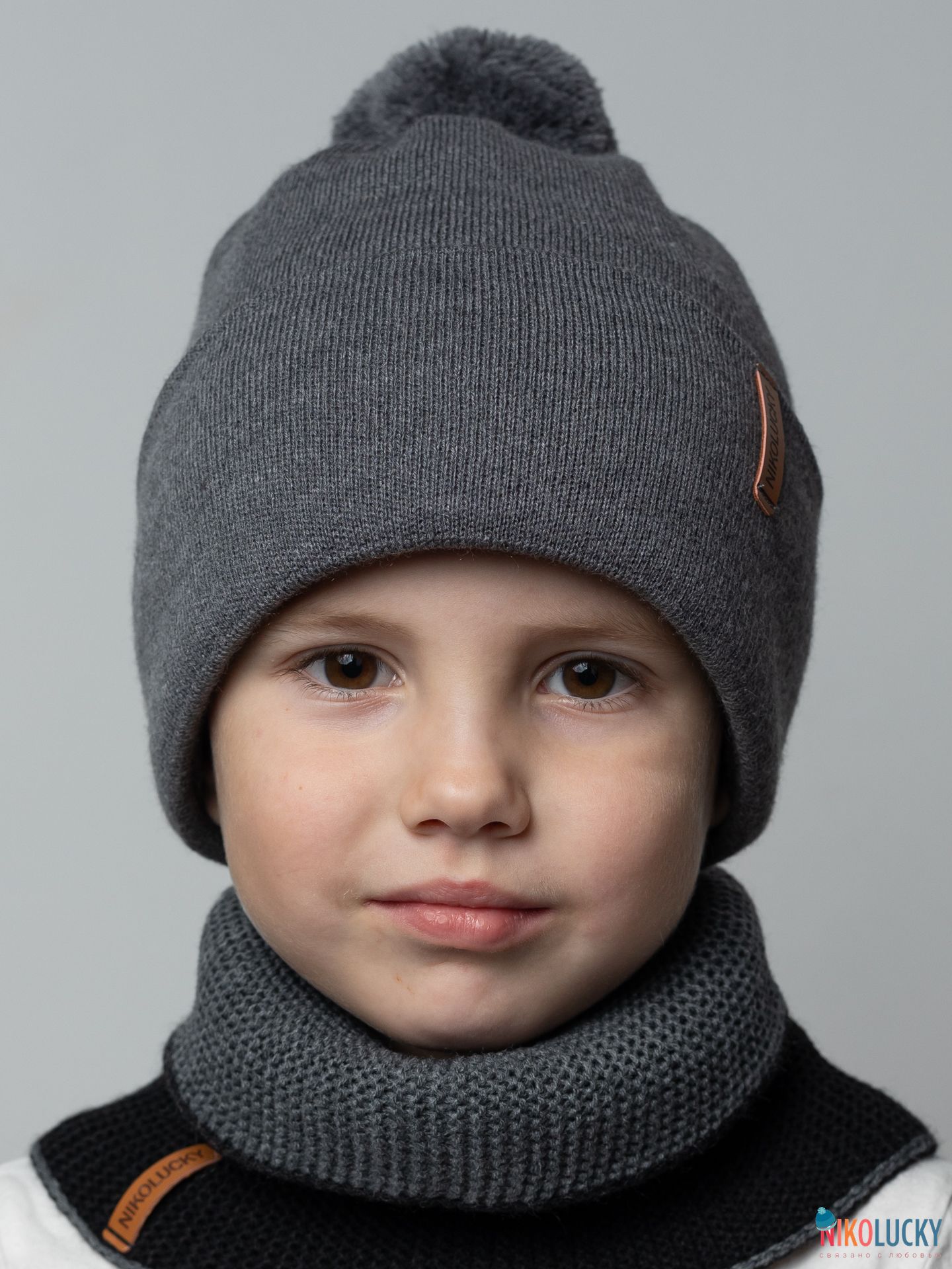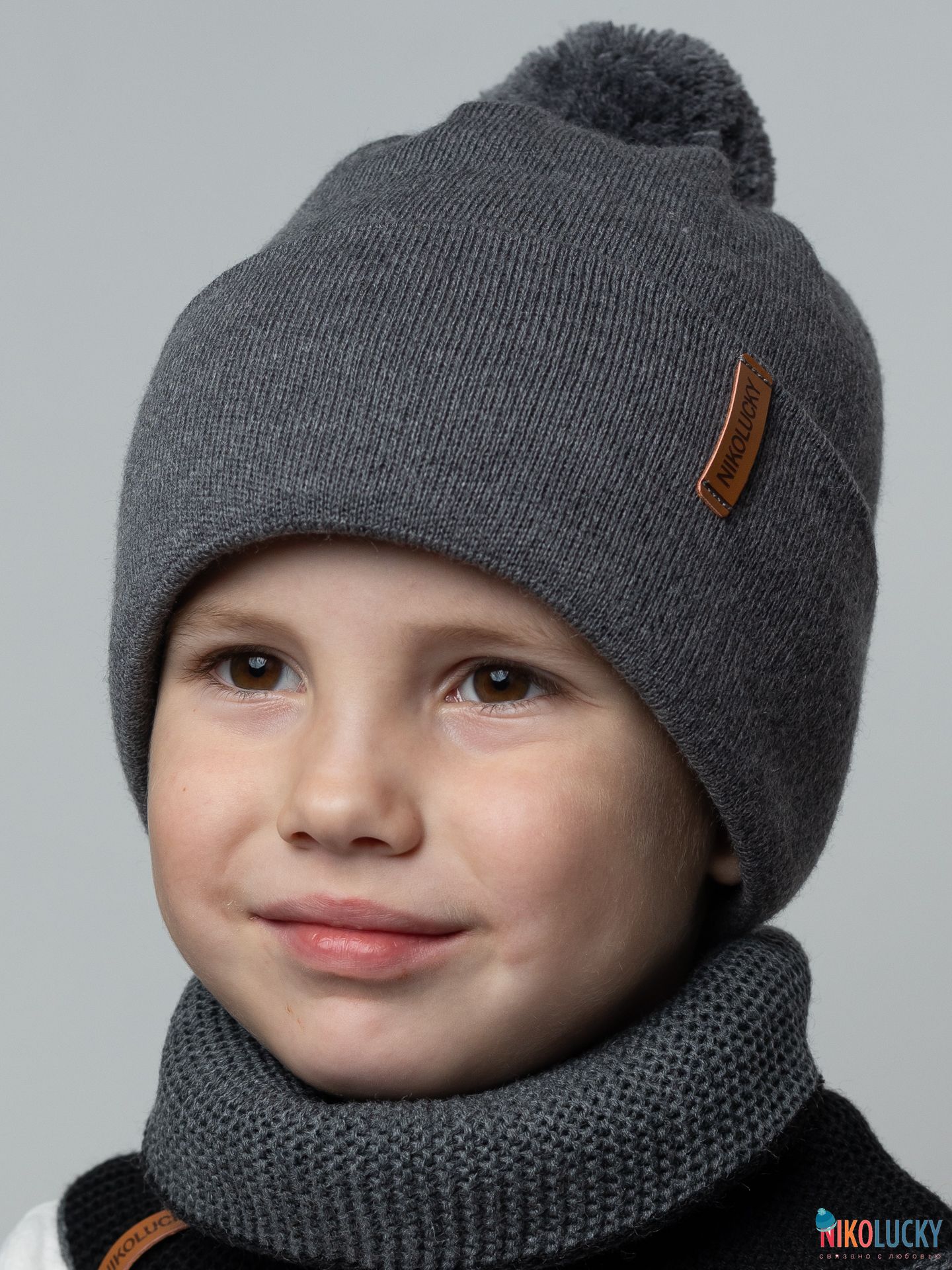 Шапка двойная зимняя с отворотом для мальчика с фирменной нашивкой из кожзама и трикотажным помпоном.