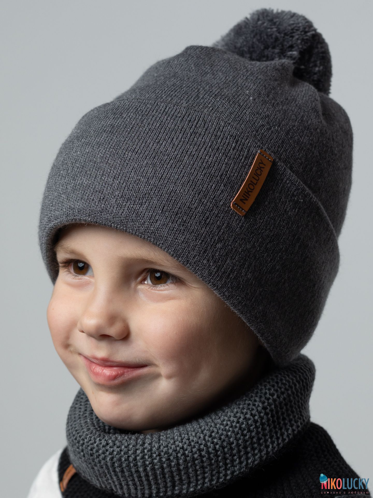 Шапка двойная зимняя с отворотом для мальчика с фирменной нашивкой из кожзама и трикотажным помпоном.