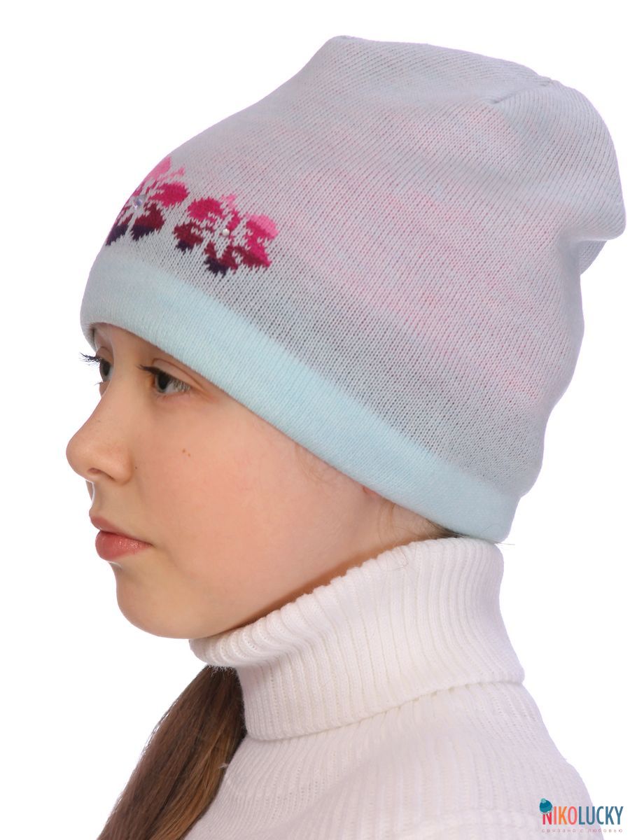 Отдельным украшением головного убора для девочки является вывязаный жаккардовый рисунок в виде цветов и стразы.