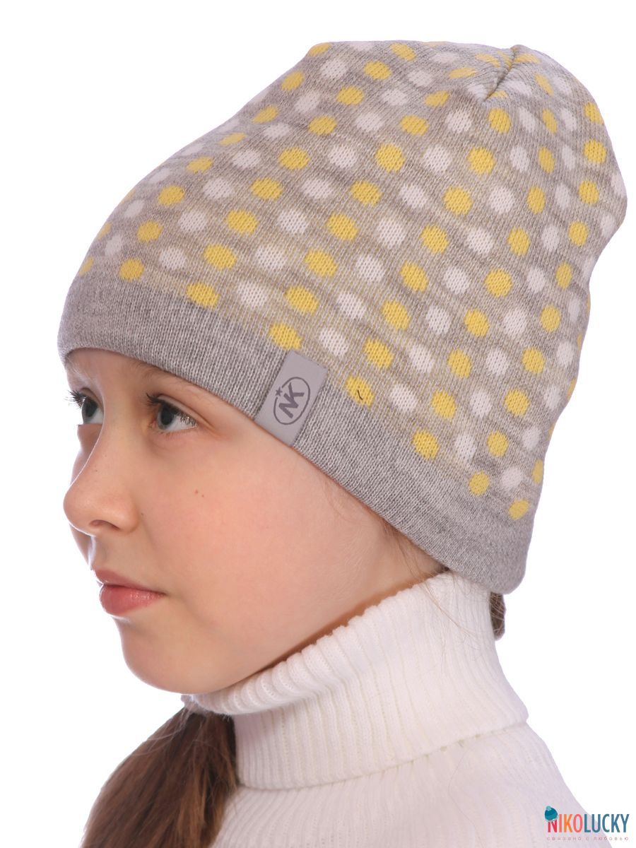 Отдельным украшением головного убора для девочки является вывязанный цветной жаккардовый рисунок в горошек .