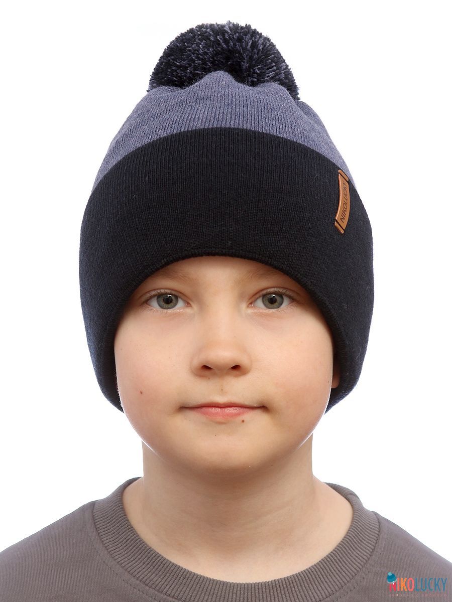 Шапка двойная зимняя с отворотом для мальчика с фирменной нашивкой из кожзама и трикотажным помпоном.