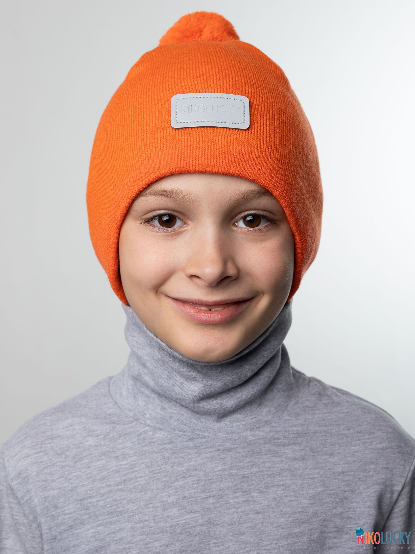 Шапка двойная для мальчика с трикотажным помпоном и светоотражающей фирменной нашивкой.
