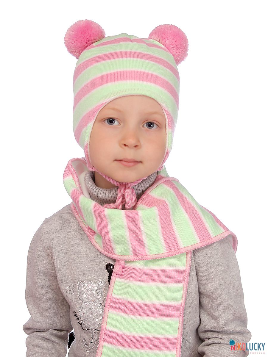 Шапка двойная для девочки сезон осень-весна на завязках с ярким рисунком в виде полос и двумя помпонами.