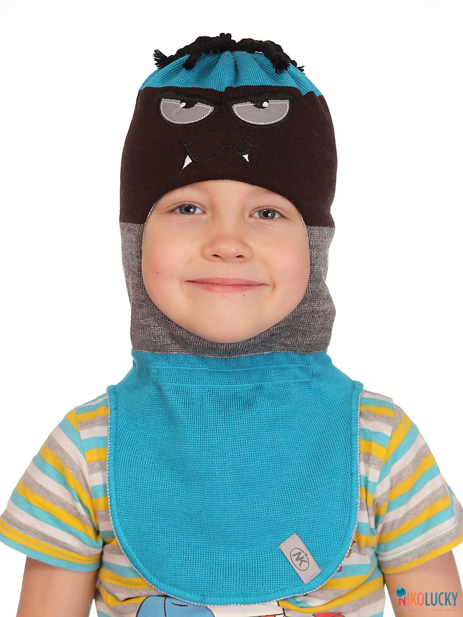Шапка-шлем двойной сезон зима для мальчика с вышитой светоотражающей аппликацией в виде глаз.