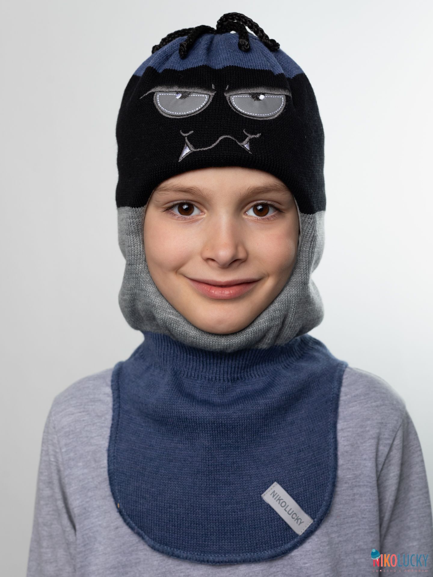 Шапка-шлем двойной сезон зима для мальчика с вышитой светоотражающей аппликацией в виде глаз.