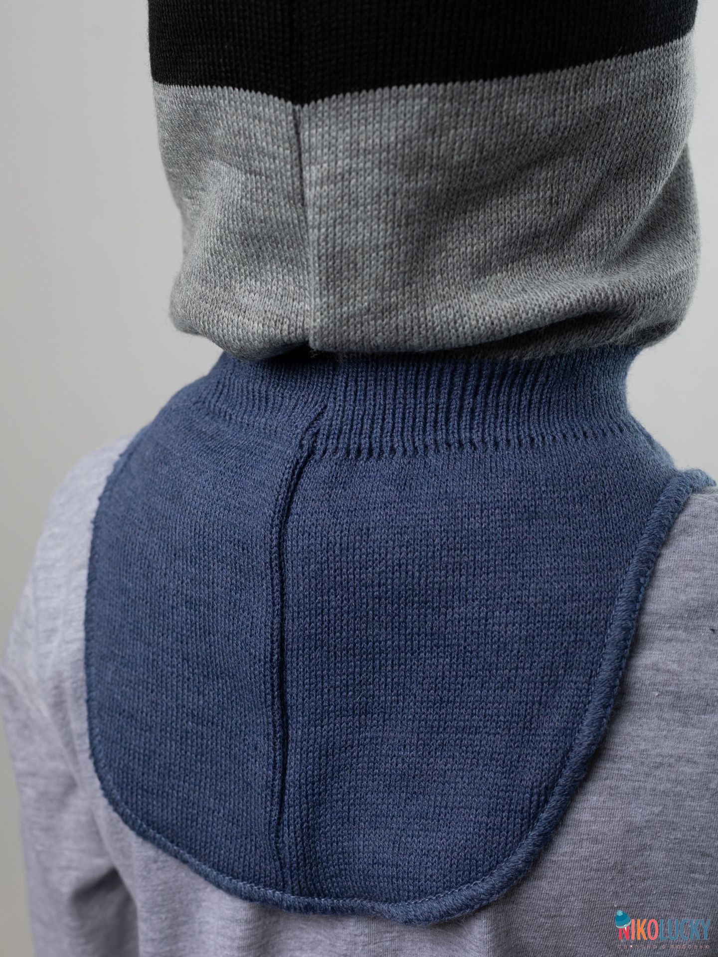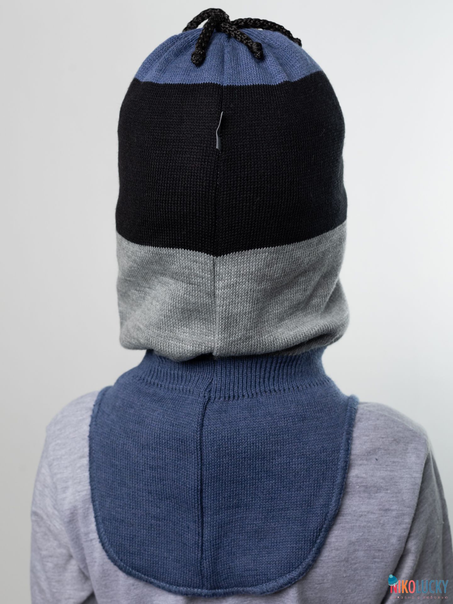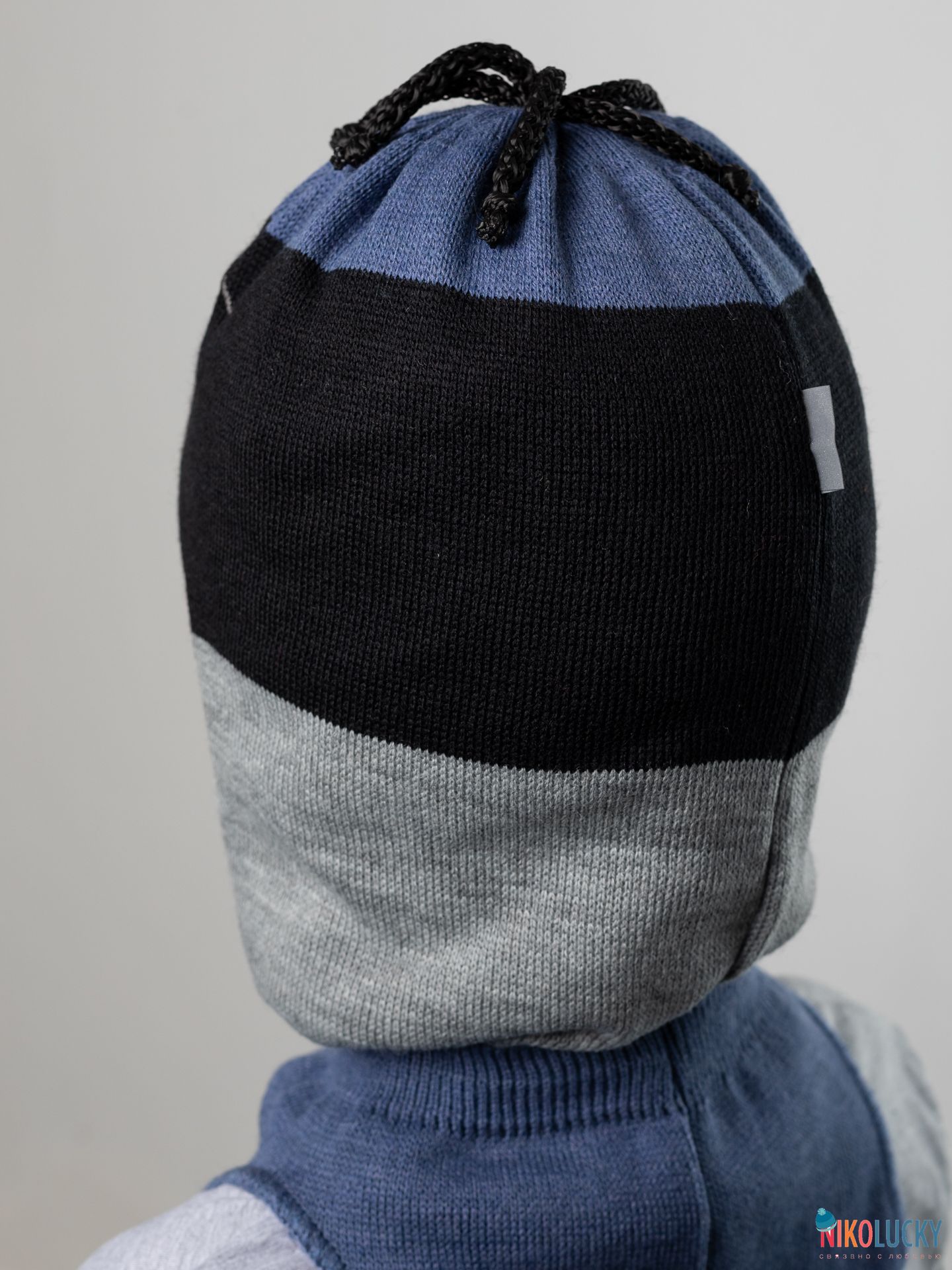 Верх связан из разноцветной пряжи с 50 % содержанием шерсти мериноса, подклад- 100% хлопок, утеплитель-современный, легкий, дышащий и очень теплый синтепон Сиберия, который идет по всей голове( кроме манишки).