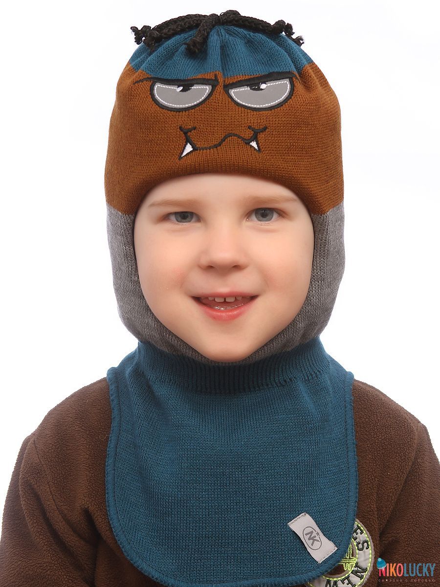 Верх связан из разноцветной пряжи с 50 % содержанием шерсти мериноса, подклад- 100% хлопок, утеплитель-современный, легкий, дышащий и очень теплый синтепон Сиберия, который идет по всей голове( кроме манишки).