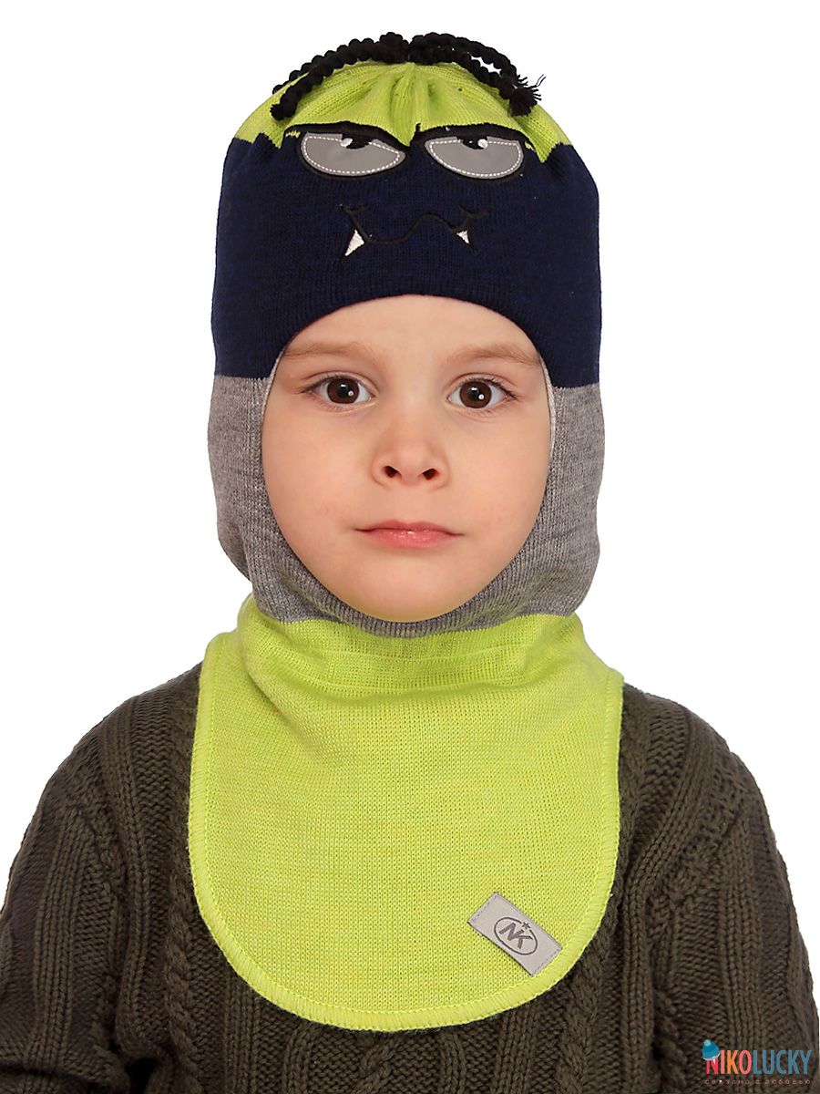 Шапка-шлем двойной сезон зима для мальчика с вышитой светоотражающей аппликацией в виде глаз.