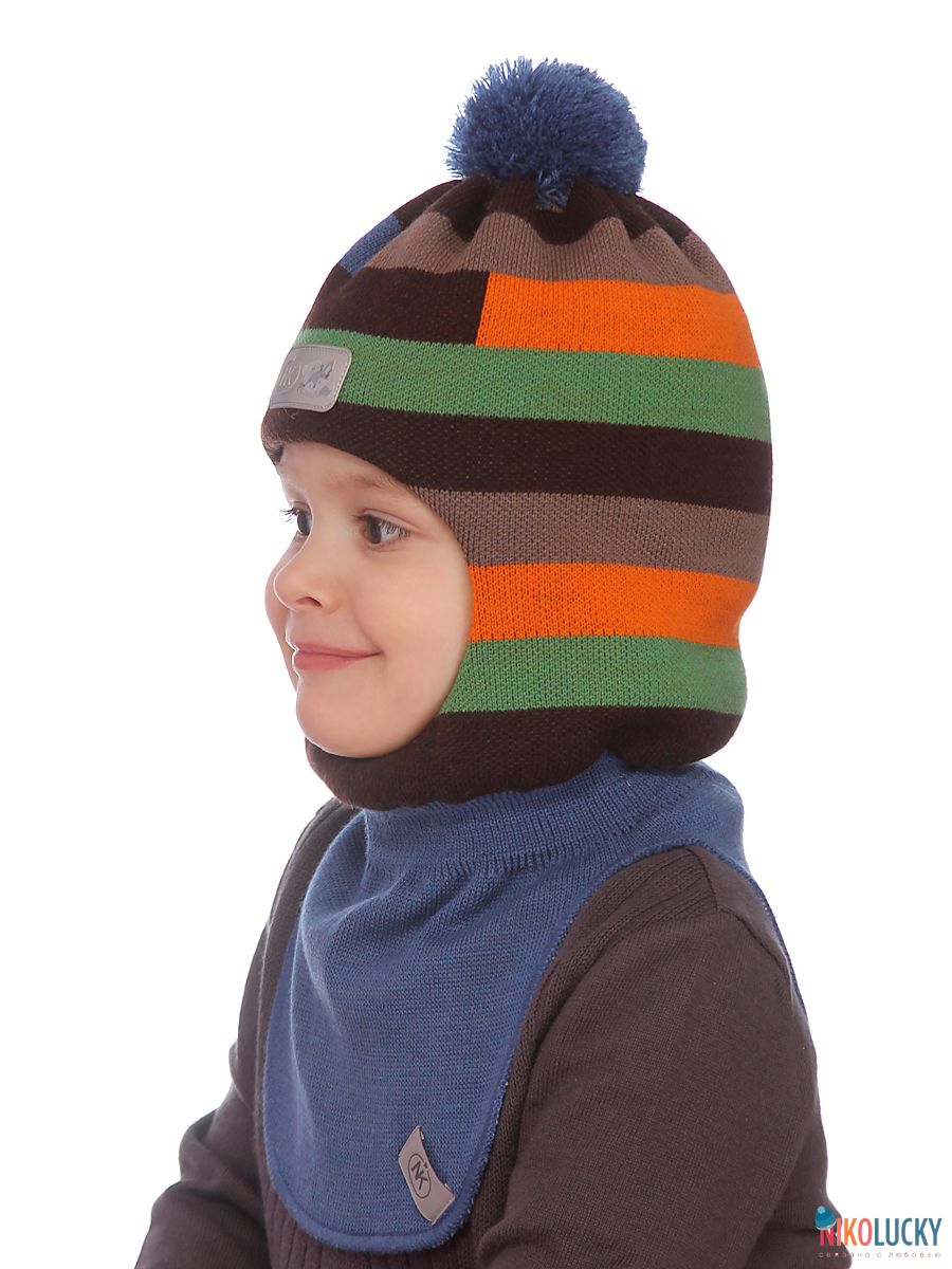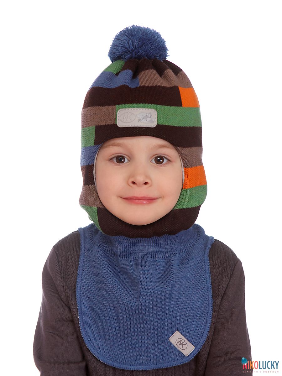 Шапка-шлем двойной зимний для мальчика с разноцветным, геометрическим рисунком и трикотажным помпоном.