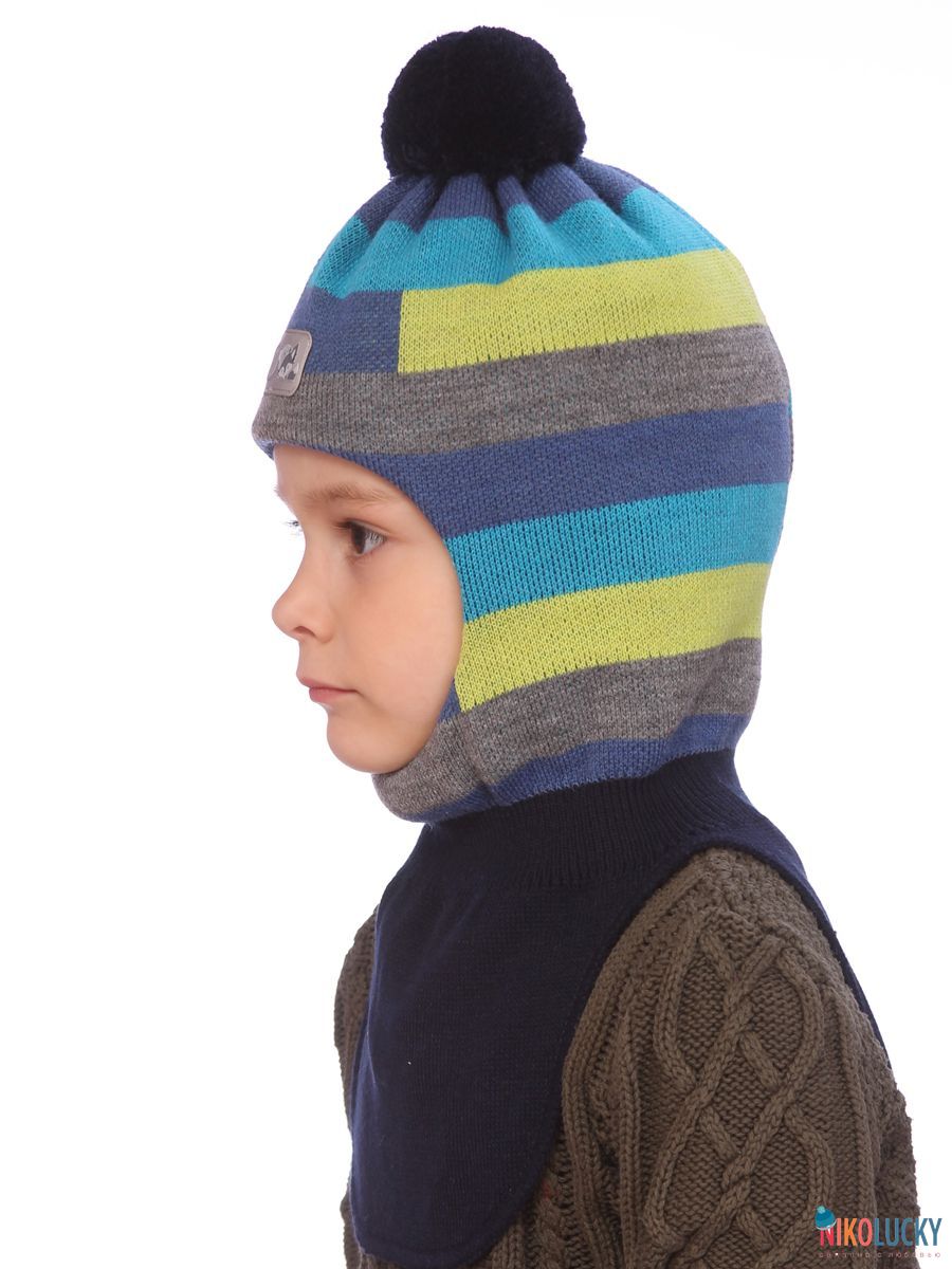 Шапка-шлем двойной зимний для мальчика с разноцветным, геометрическим рисунком и трикотажным помпоном.