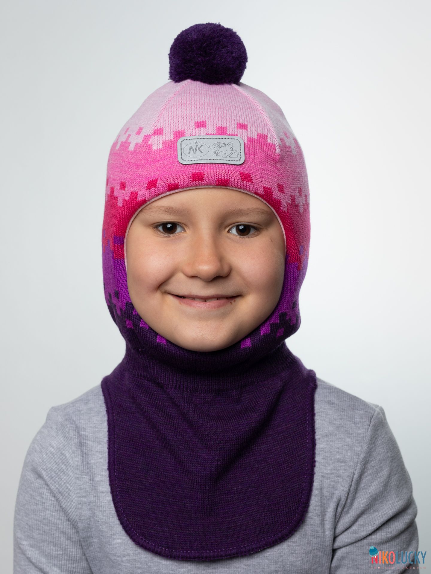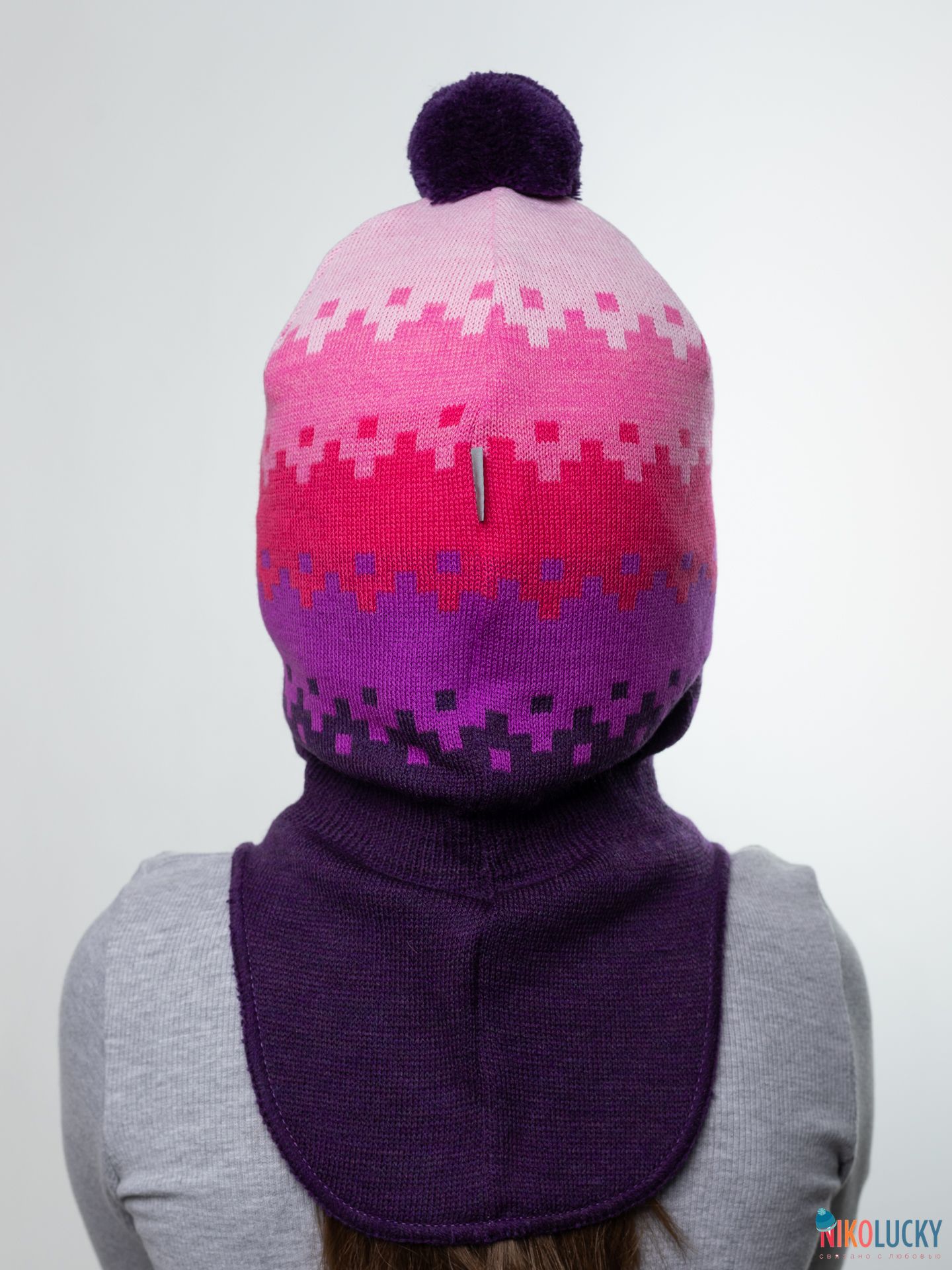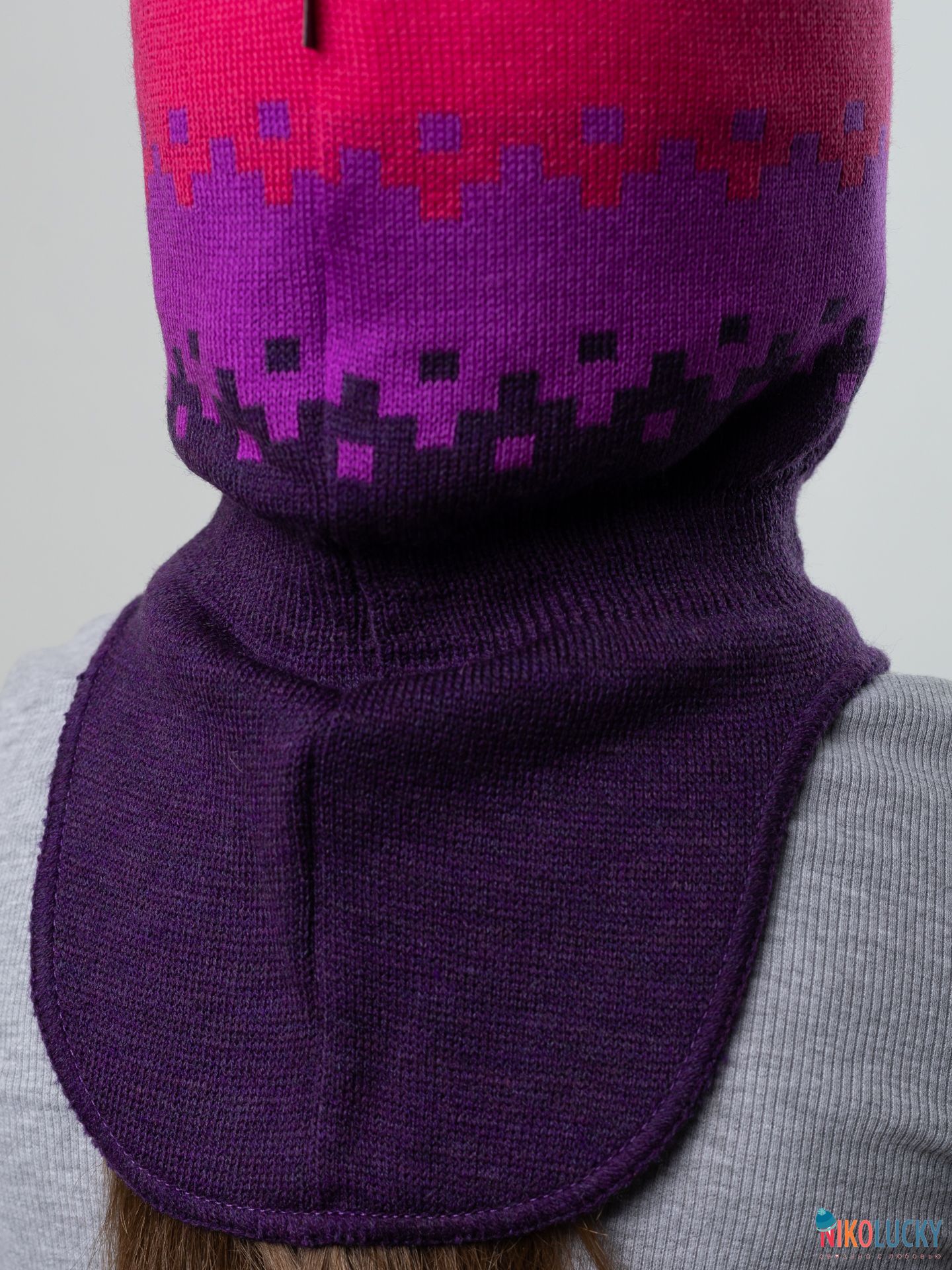 Шапка-шлем двойной, зимний для девочки с геометрическим и ярким рисунком.