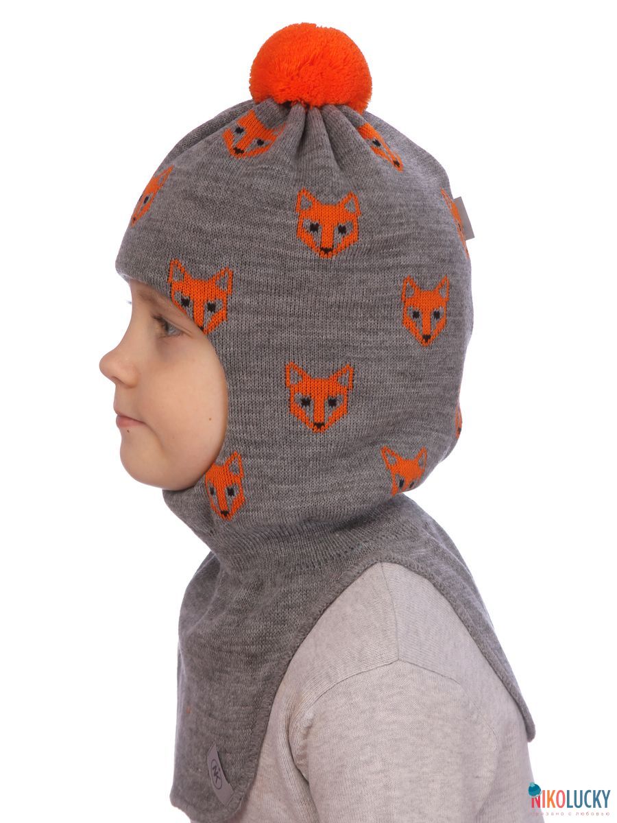 Шапка-шлем двойной зимний для мальчика с трикотажным помпоном и вывязанным цветным рисунком в виде мордочек лисят.