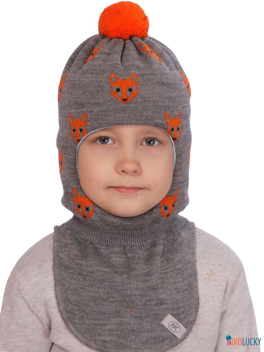 Шапка-шлем двойной зимний для мальчика с трикотажным помпоном и вывязанным цветным рисунком в виде мордочек лисят.