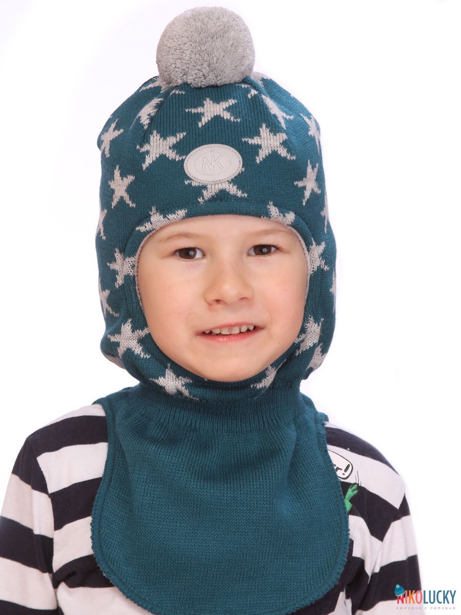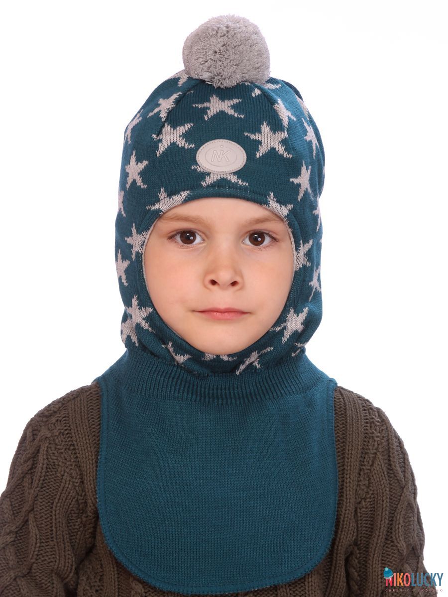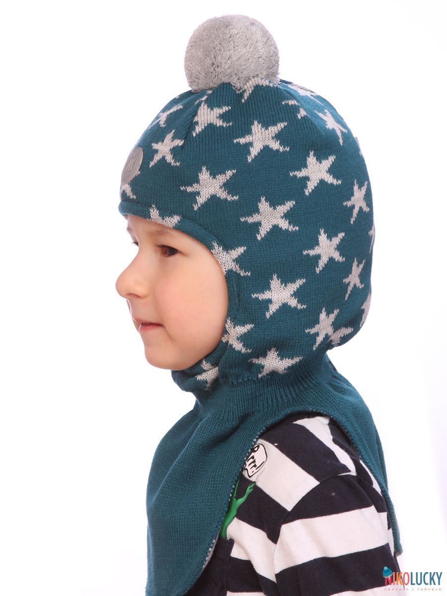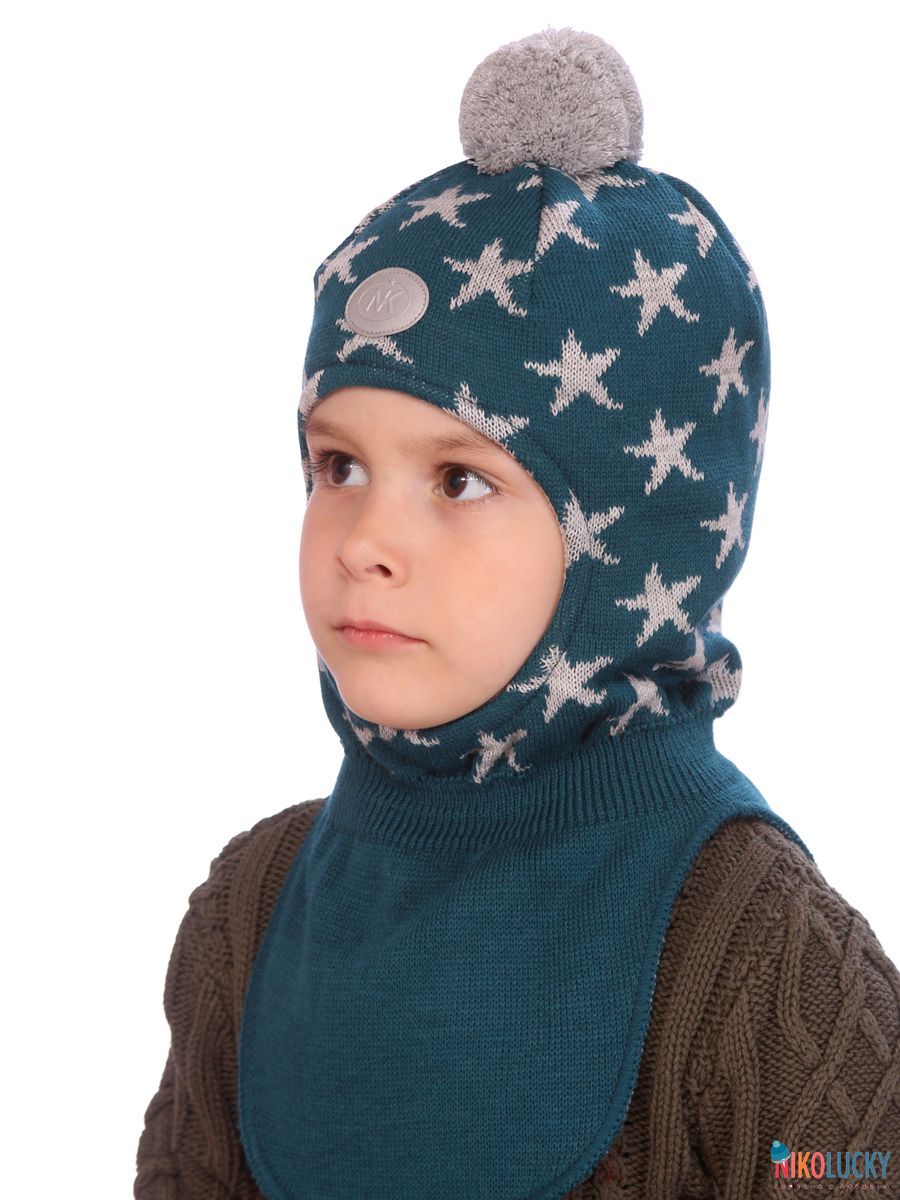 Шапка-шлем двойной для мальчика с ярким рисунком в виде звезд и трикотажным помпоном.