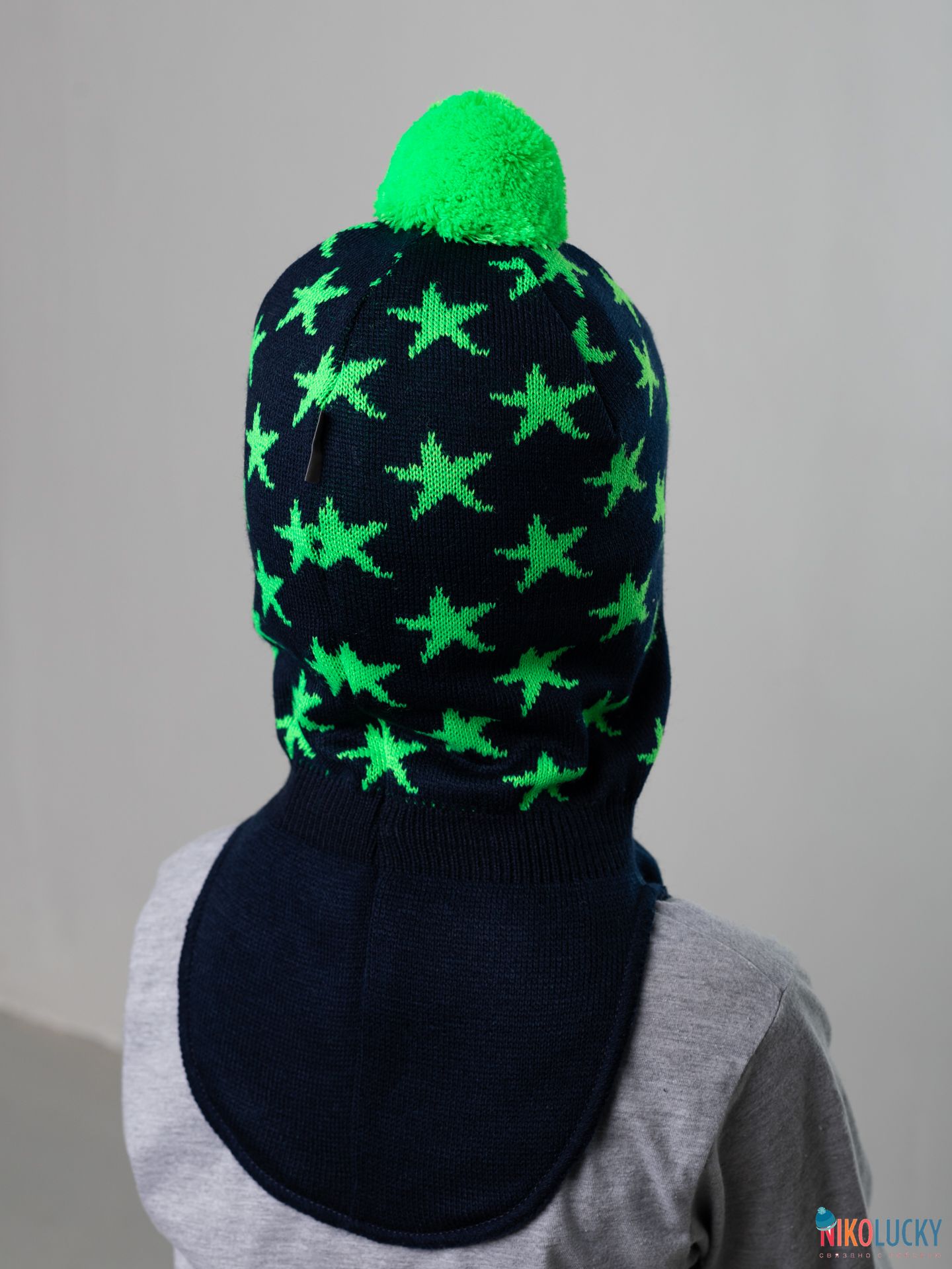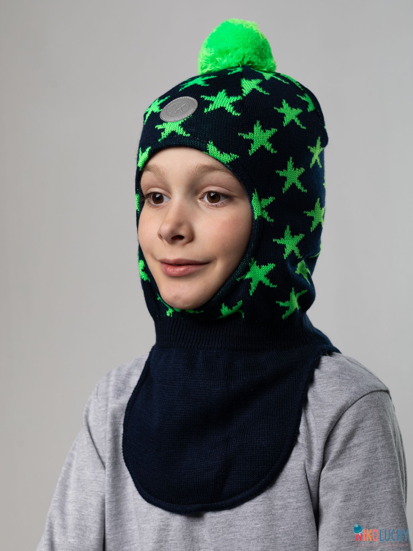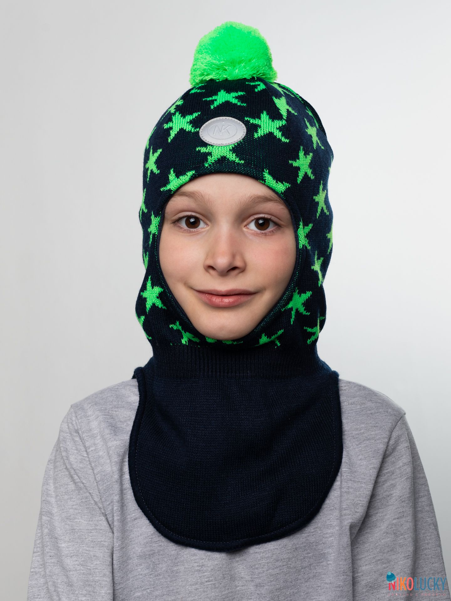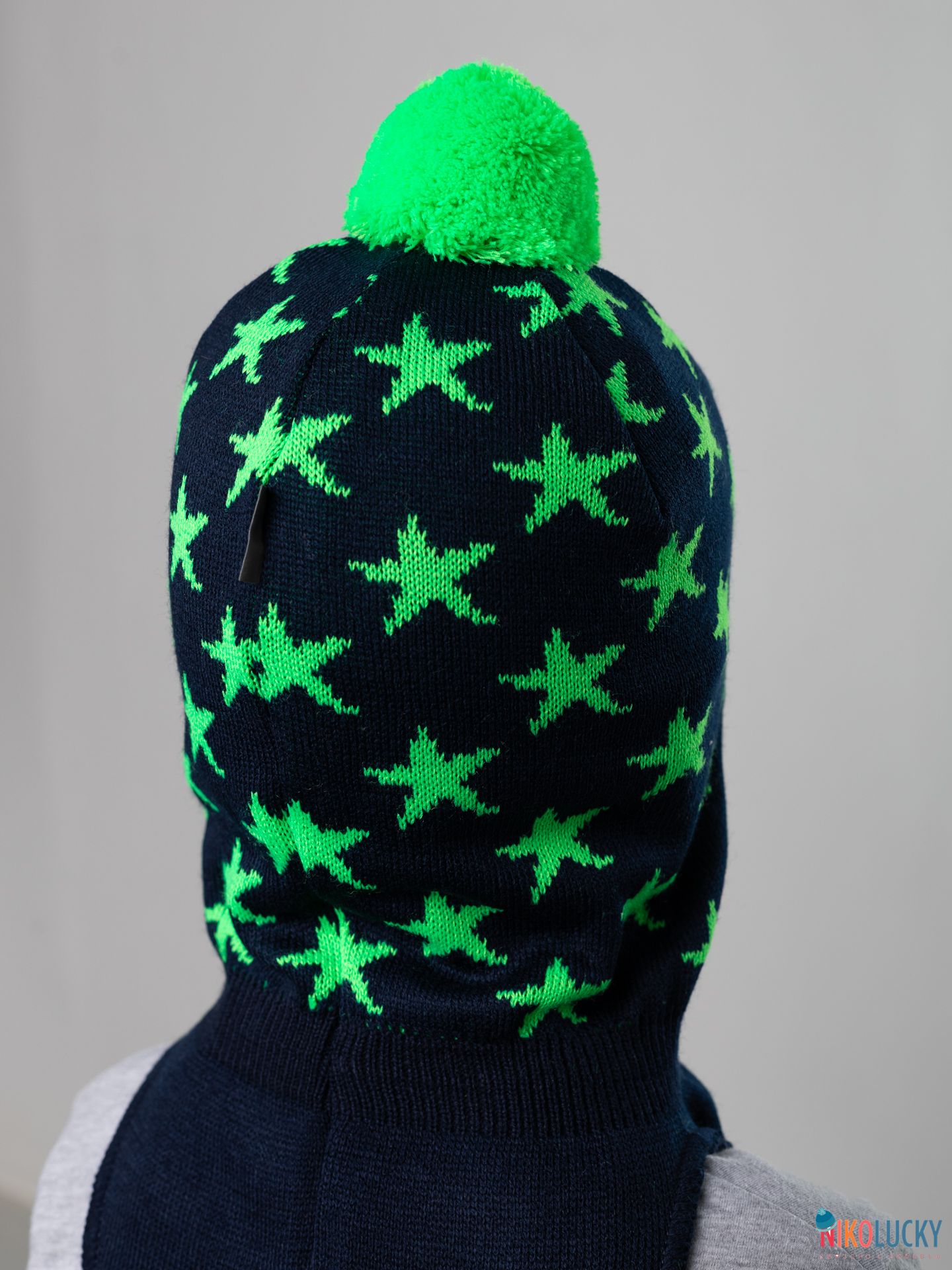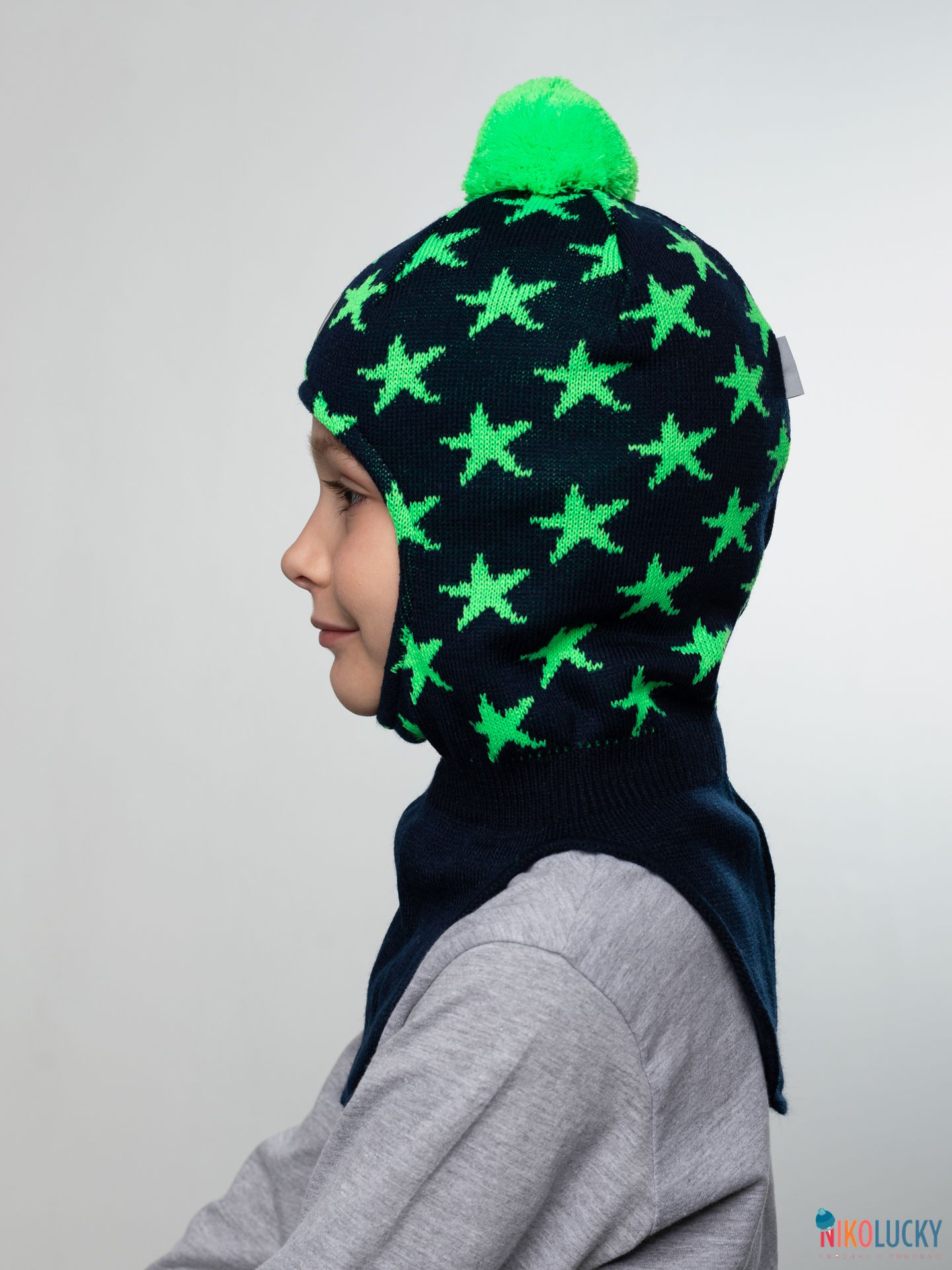 Шапка-шлем двойной для мальчика с ярким рисунком в виде звезд и трикотажным помпоном.