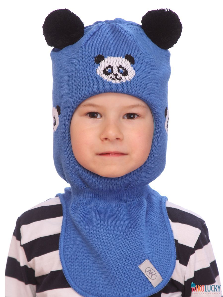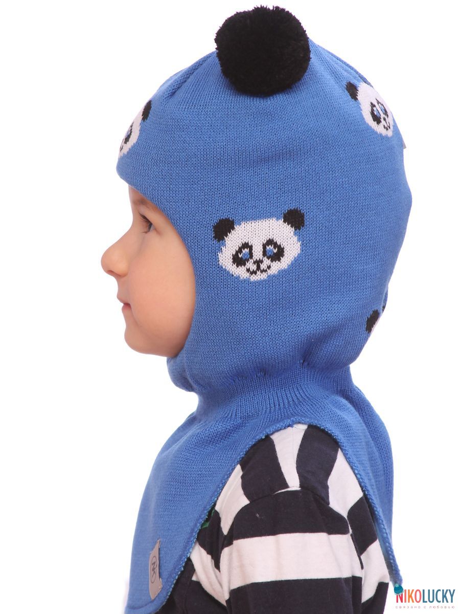 Шапка-шлем двойной зимний для мальчика с забавным и ярким рисунком в виде мишек панды и двумя трикотажными помпонами.