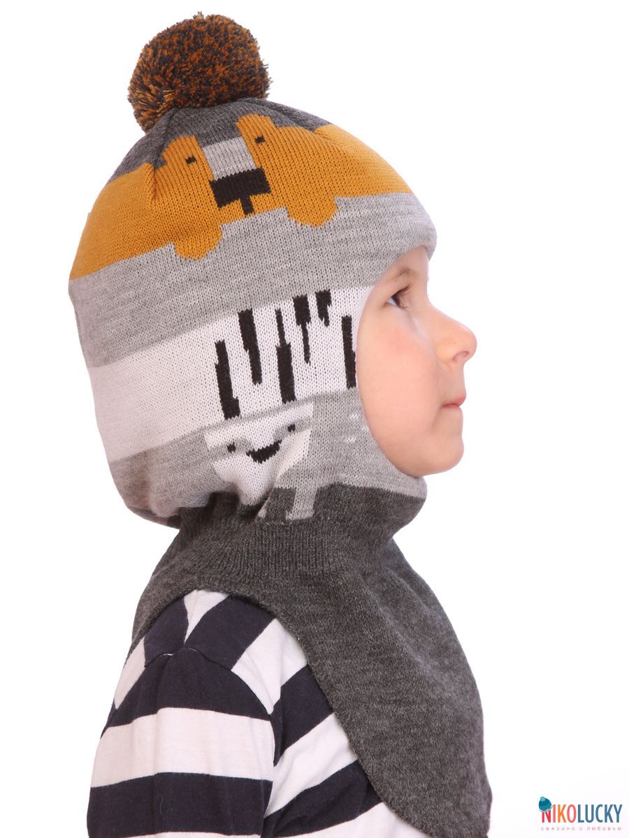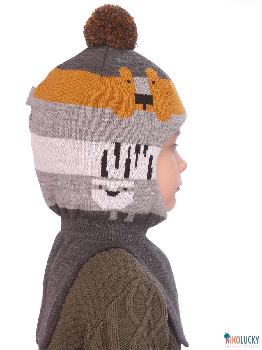 Шапка-шлем двойной зимний для мальчика с разноцветным, ярким рисунком в стиле сафари и трикотажным помпоном.