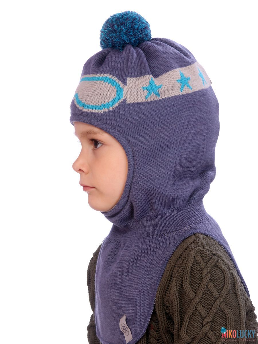 Шапка-шлем двойной сезон осень-зима для мальчика с цветным рисунком в виде очков сноубордиста и трикотажным помпоном.