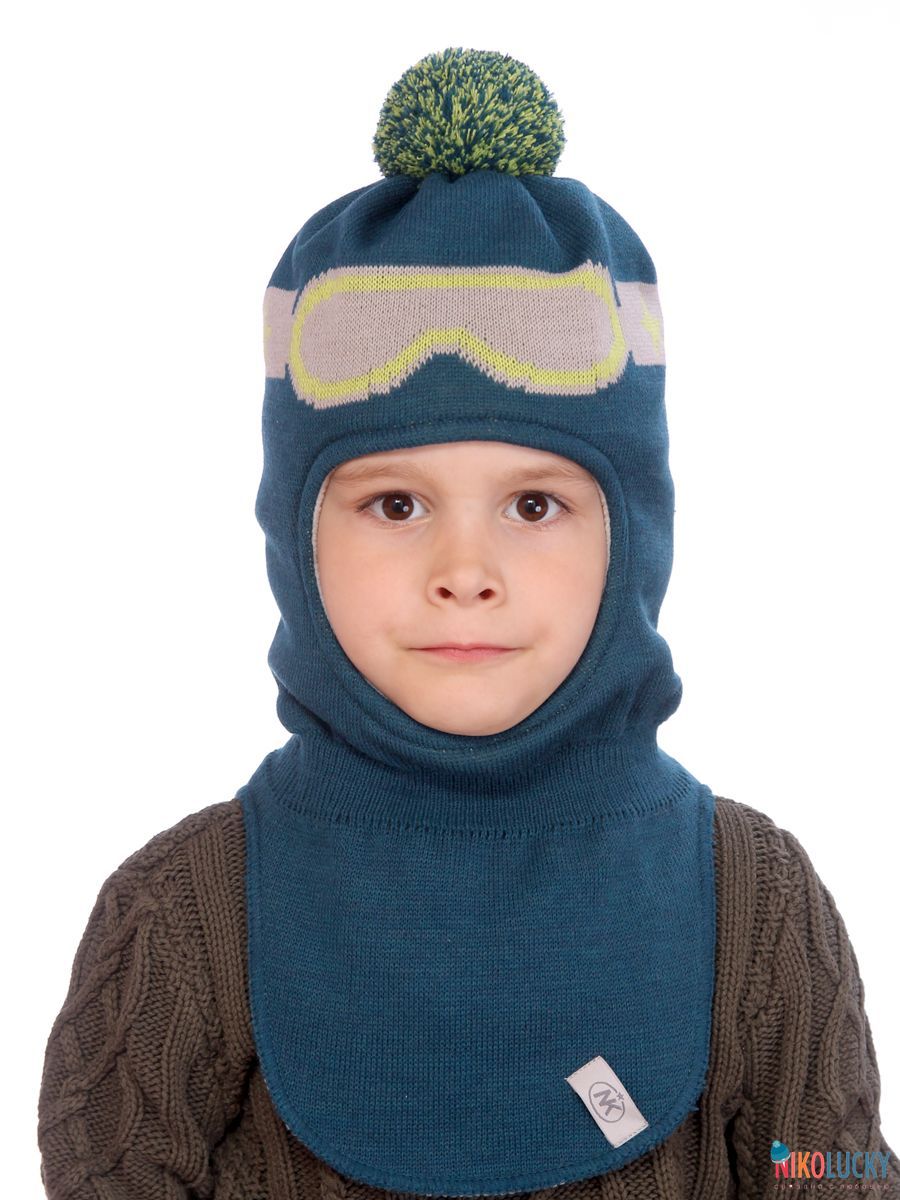 Шапка-шлем двойной сезон осень-зима для мальчика с цветным рисунком в виде очков сноубордиста и трикотажным помпоном.