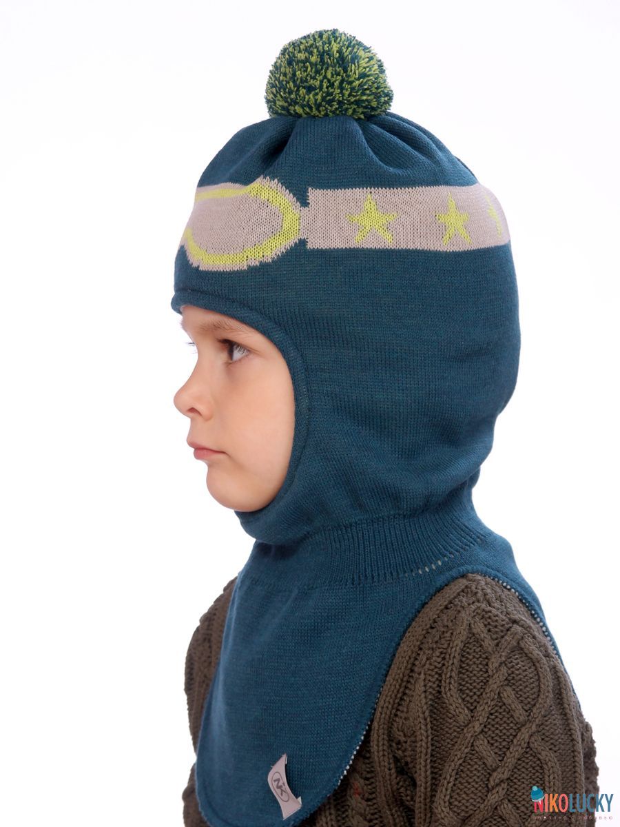 Шапка-шлем двойной сезон осень-зима для мальчика с цветным рисунком в виде очков сноубордиста и трикотажным помпоном.