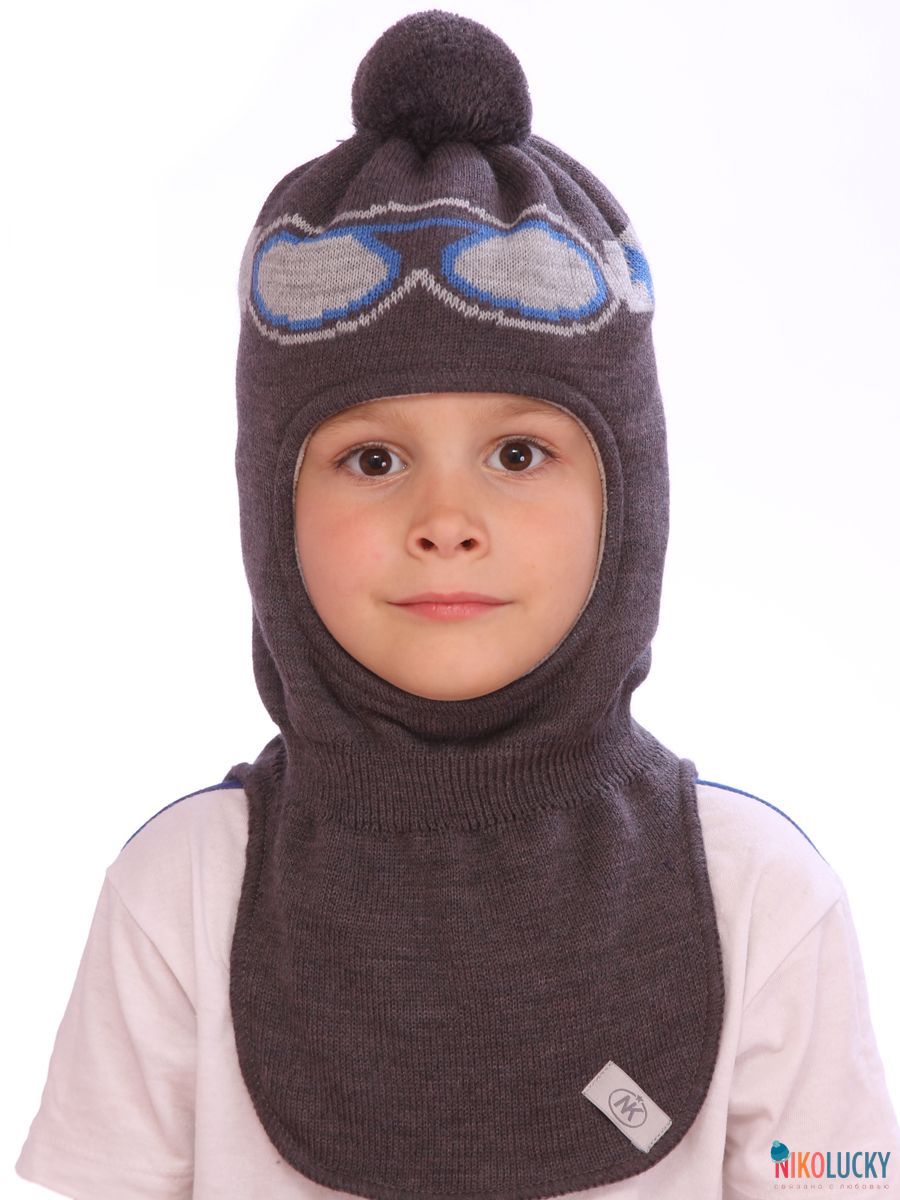 Шапка-шлем двойной сезон осень-зима для мальчика с цветным рисунком в виде очков сноубордиста и трикотажным помпоном.