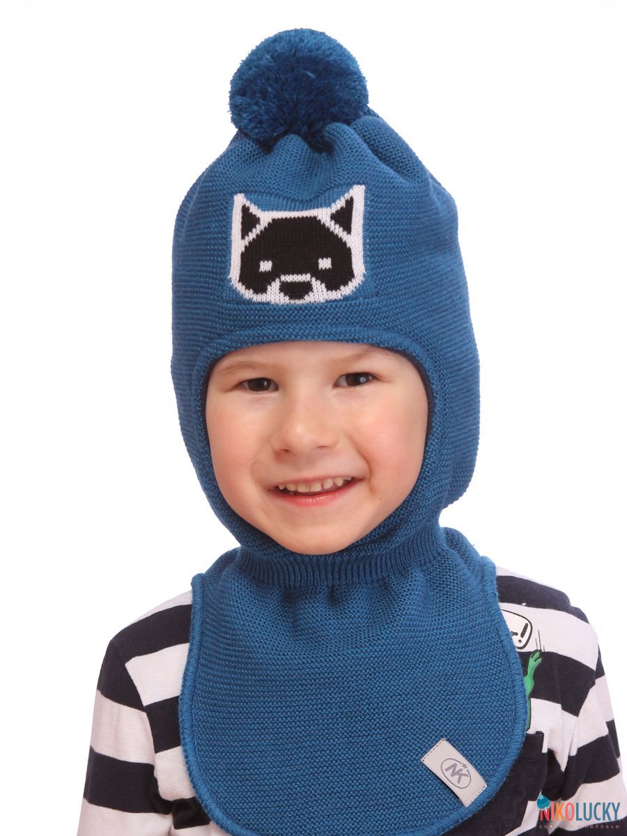 Шапка-шлем двойной сезон осень-зима на мальчика с вывязанным рисунком в виде мордочки волчонка и трикотажным помпоном.