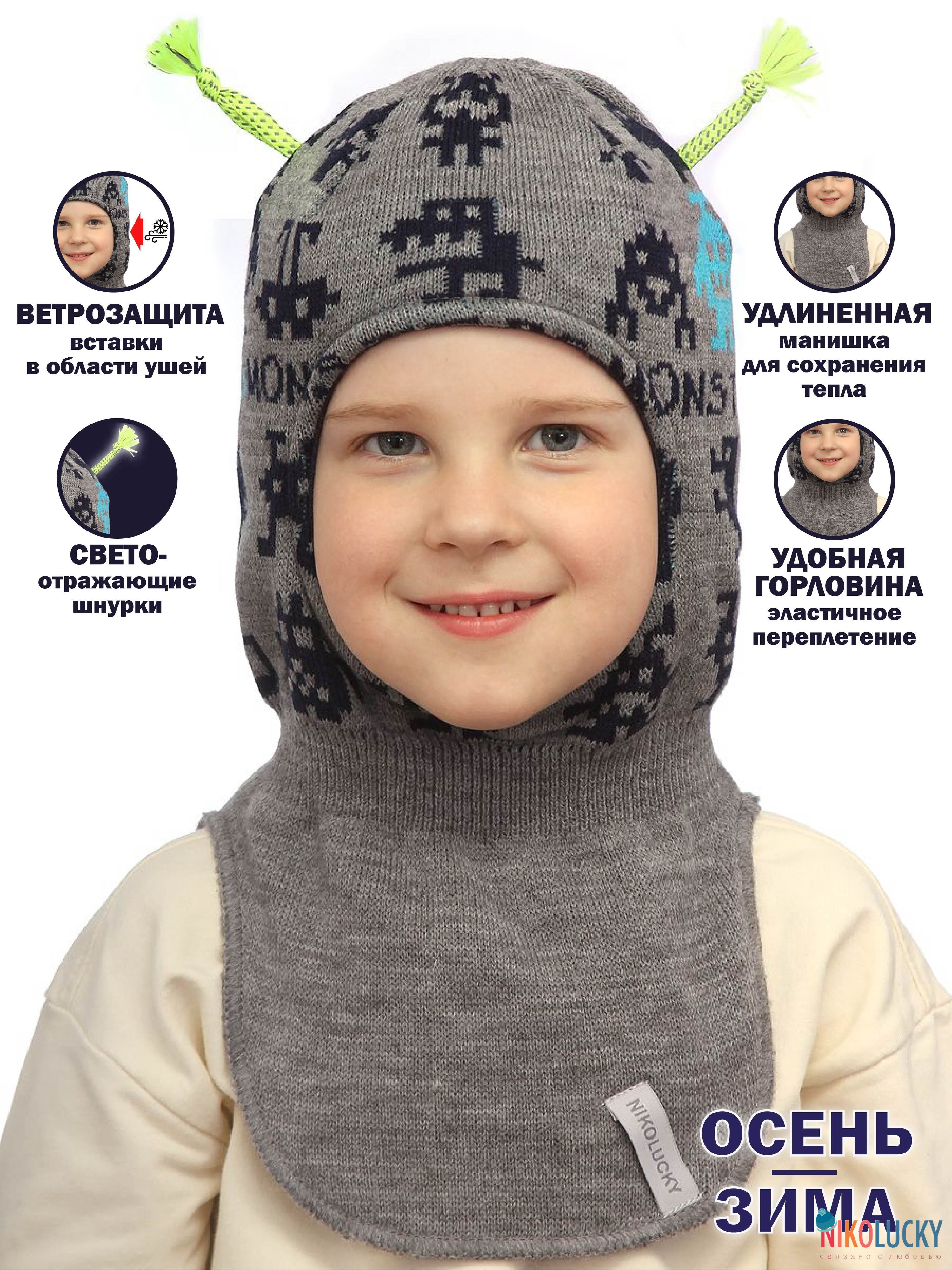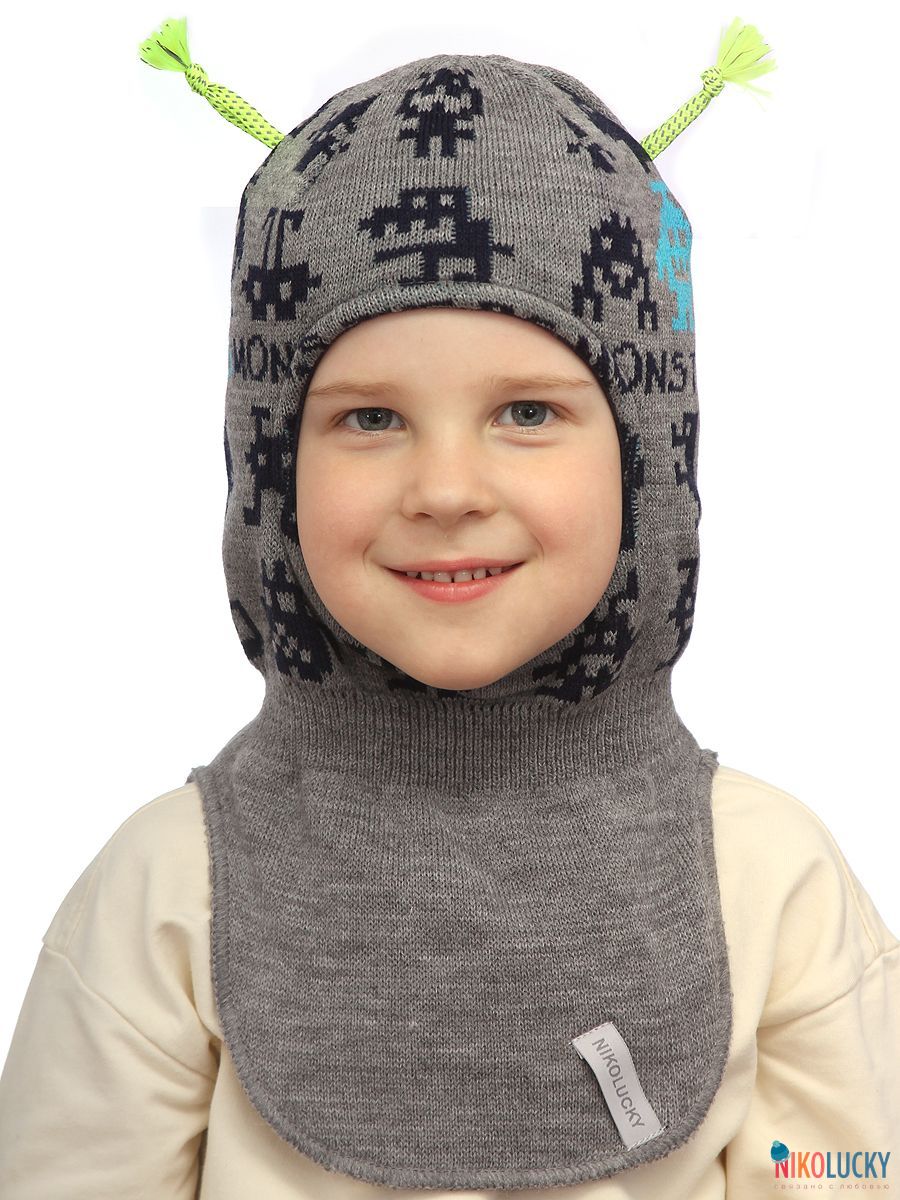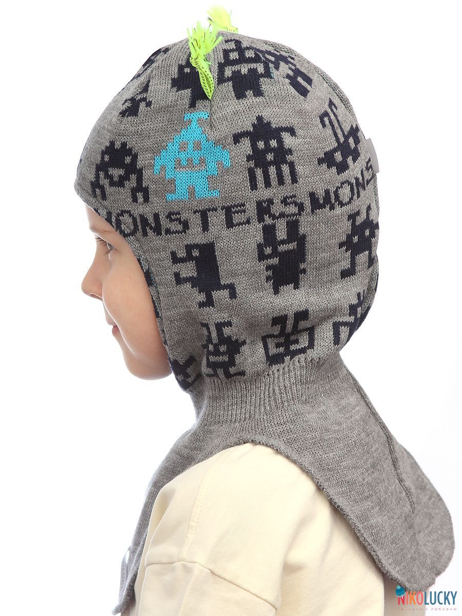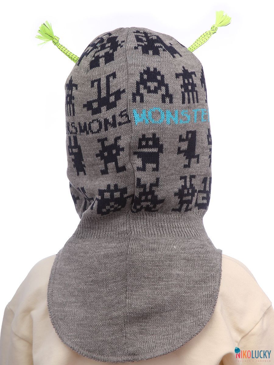 Шапка шлем для мальчика двойной сезона осень-зима с вывязанным разноцветным рисунком в виде стилизованных монстриков.