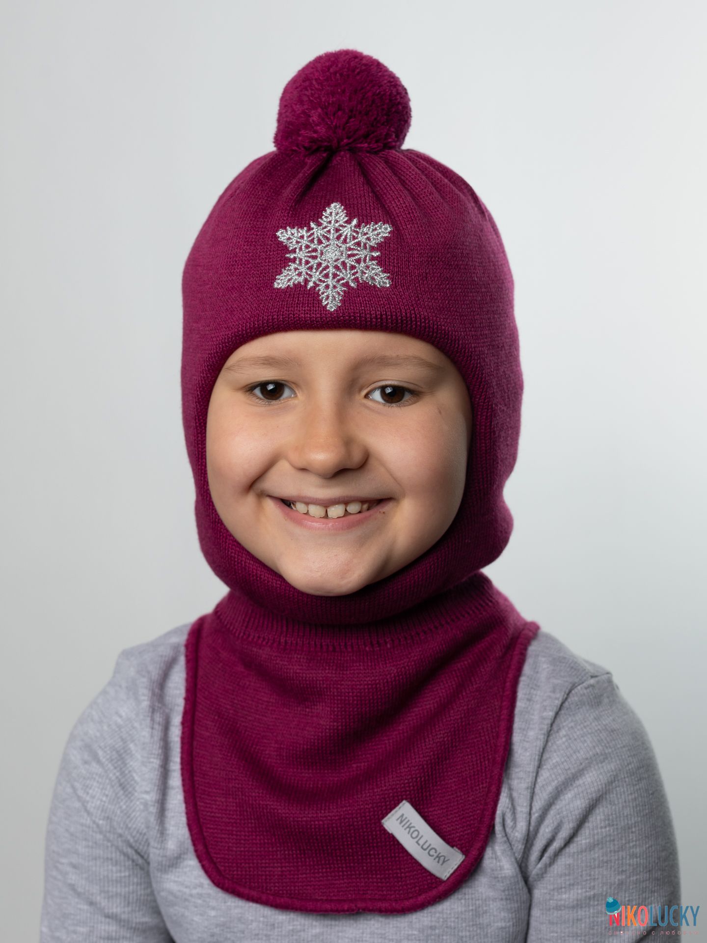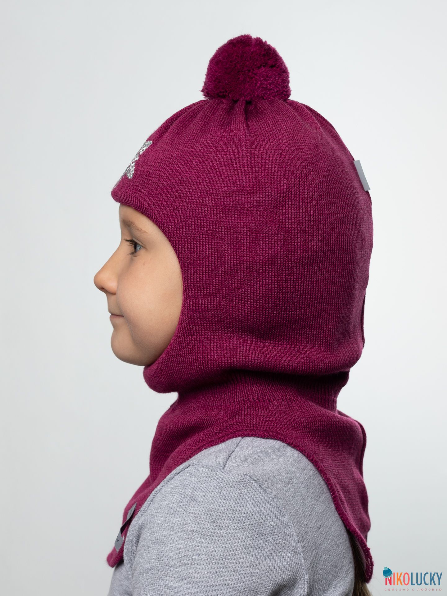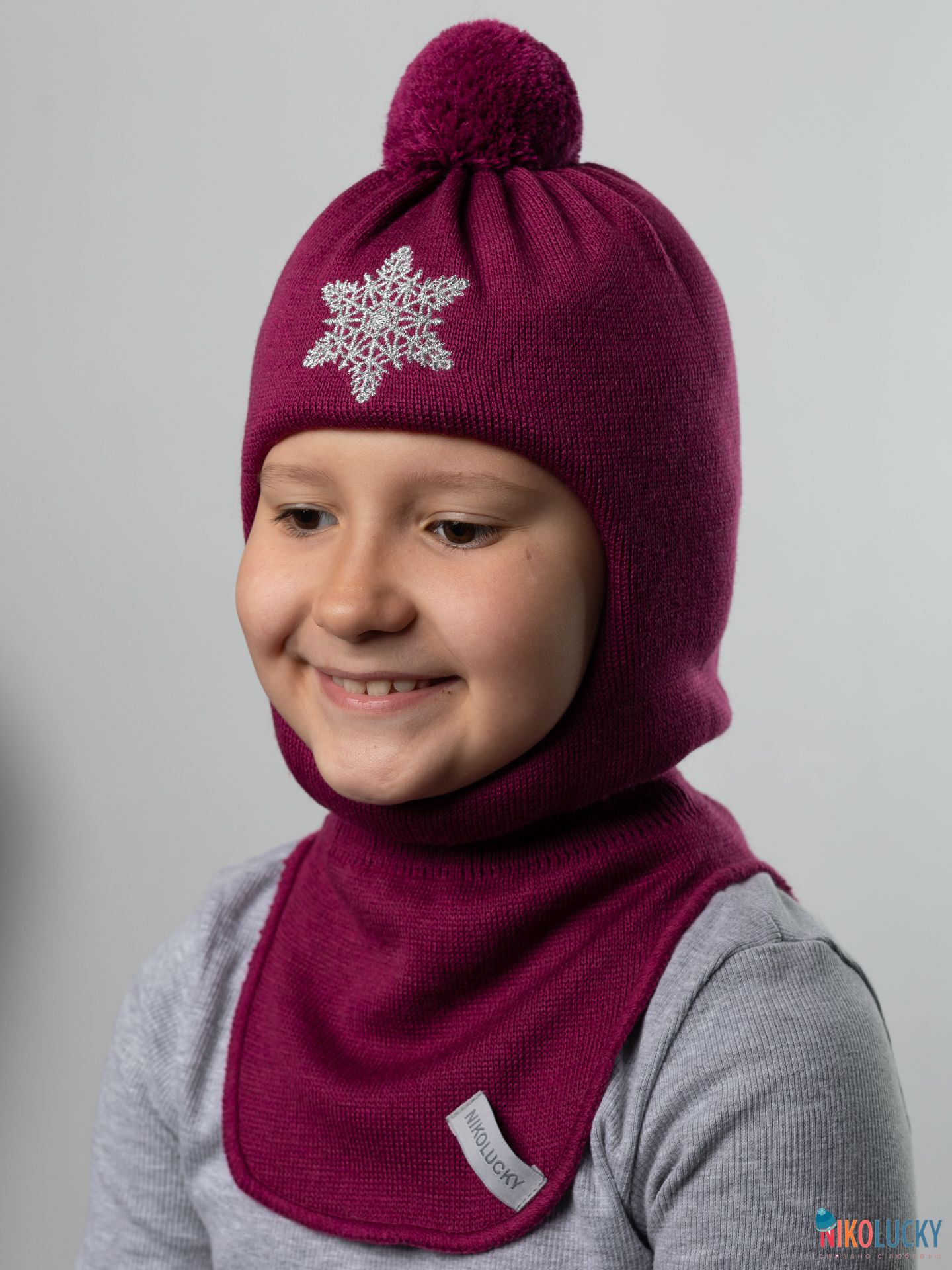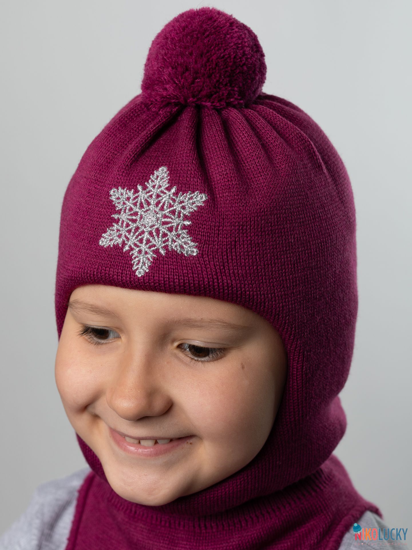 Шапка-шлем спереди украшена вышивкой в виде снежинки из люрексовых ниток, сверху – трикотажный помпон в цвет шлема.