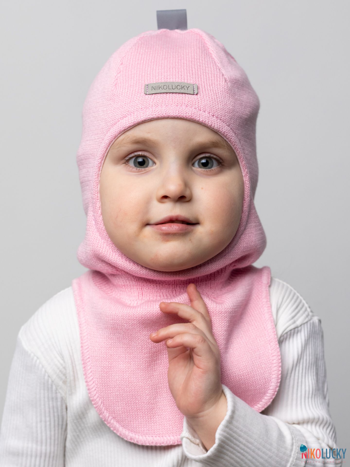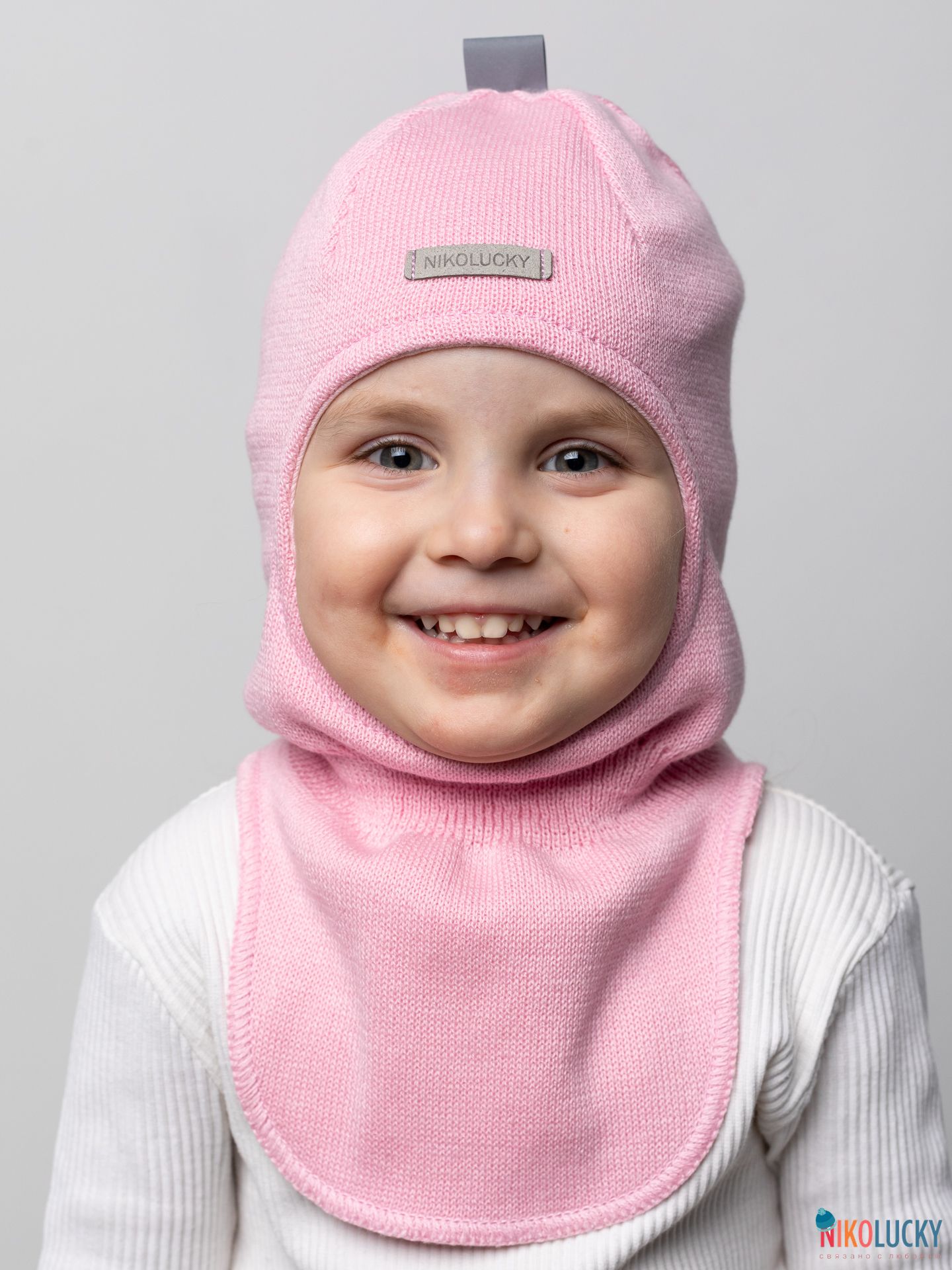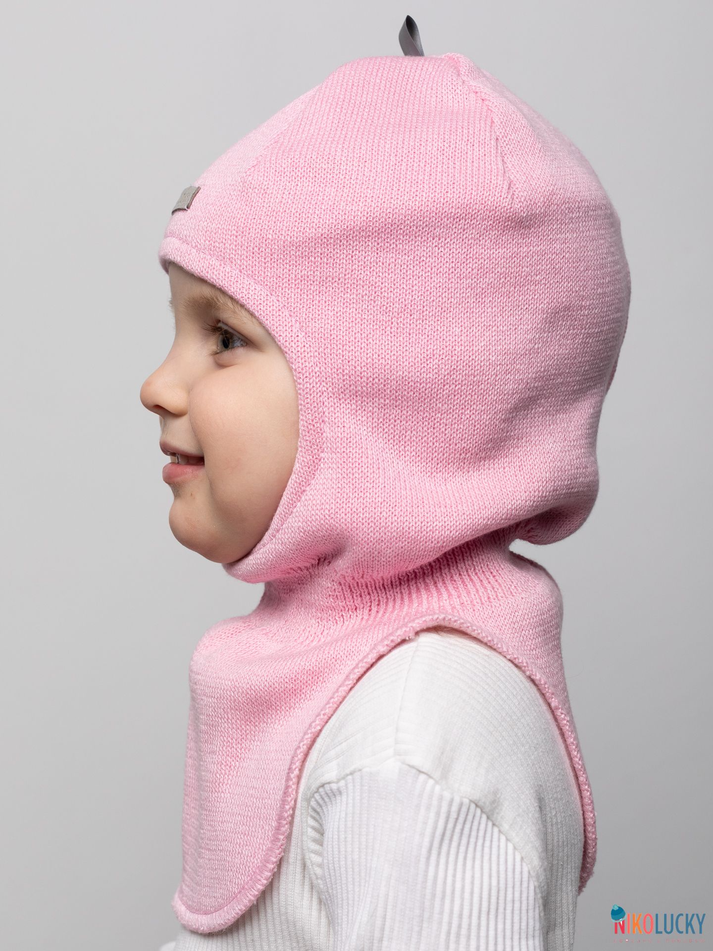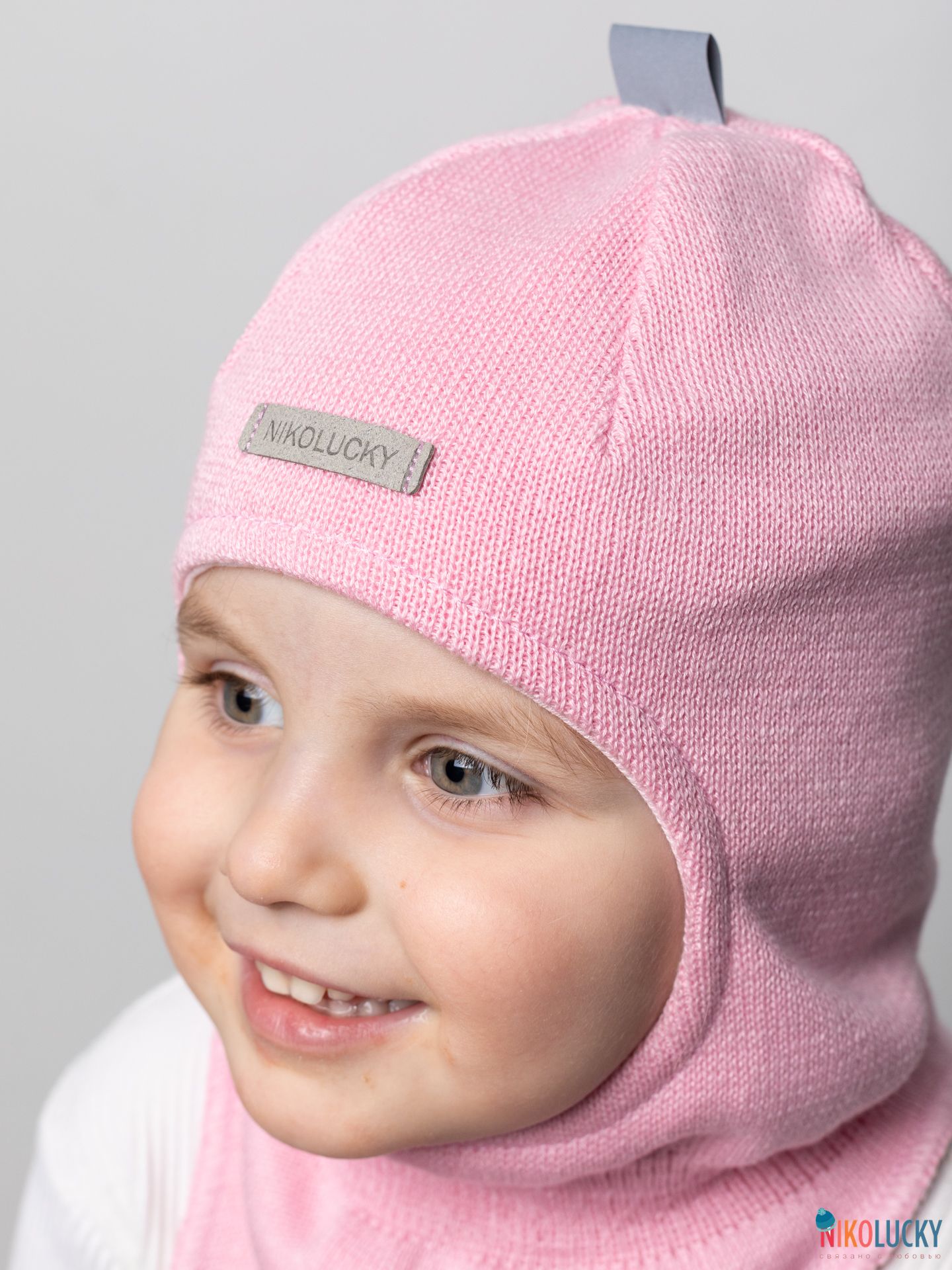 Головной убор для девочки украшает фирменная нашивка "NIKOLUCKY" из кожзама, а для дополнительной безопасности ребенка в темное время суток, сверху пришита светоотражающая тесьма.