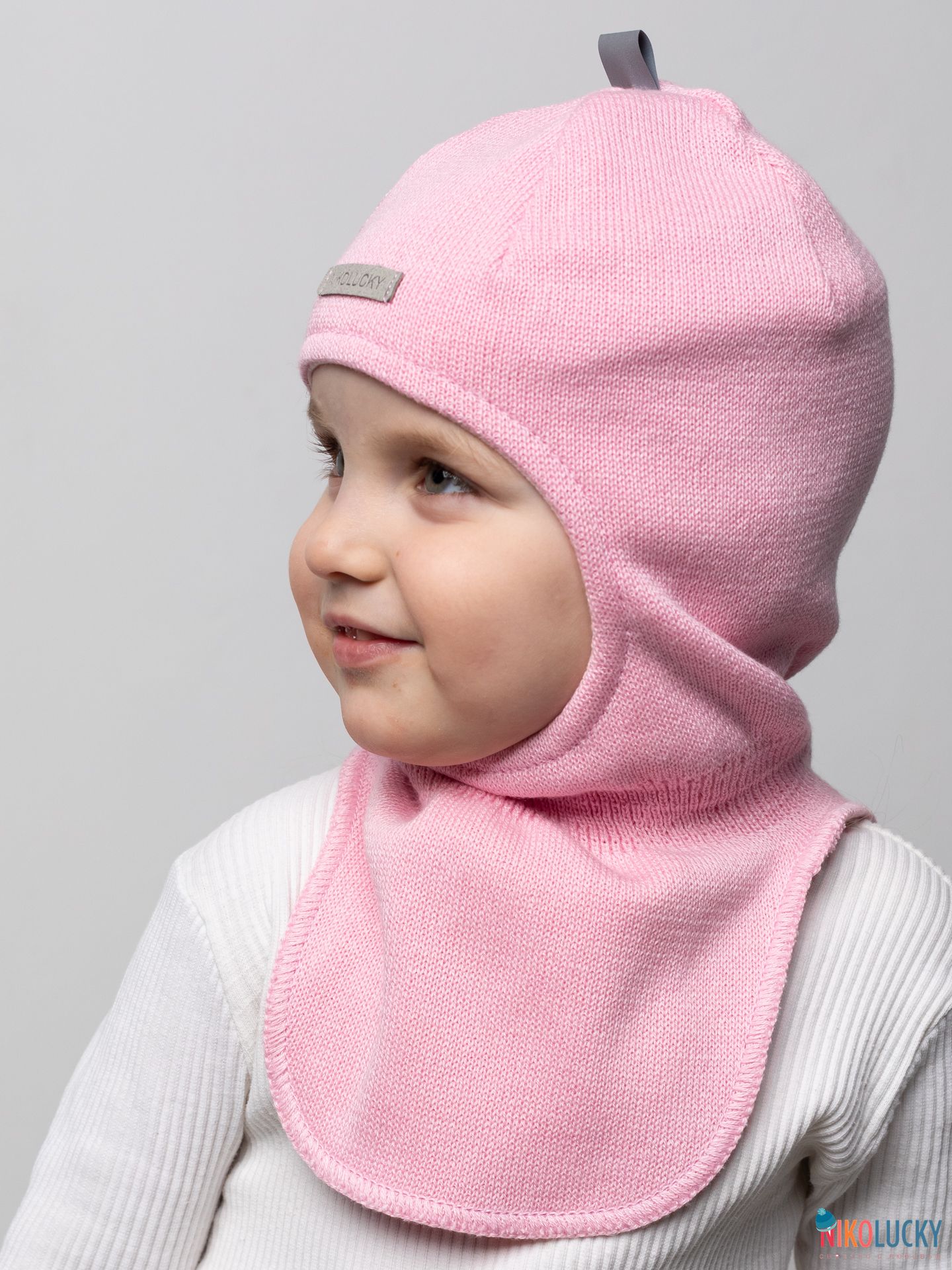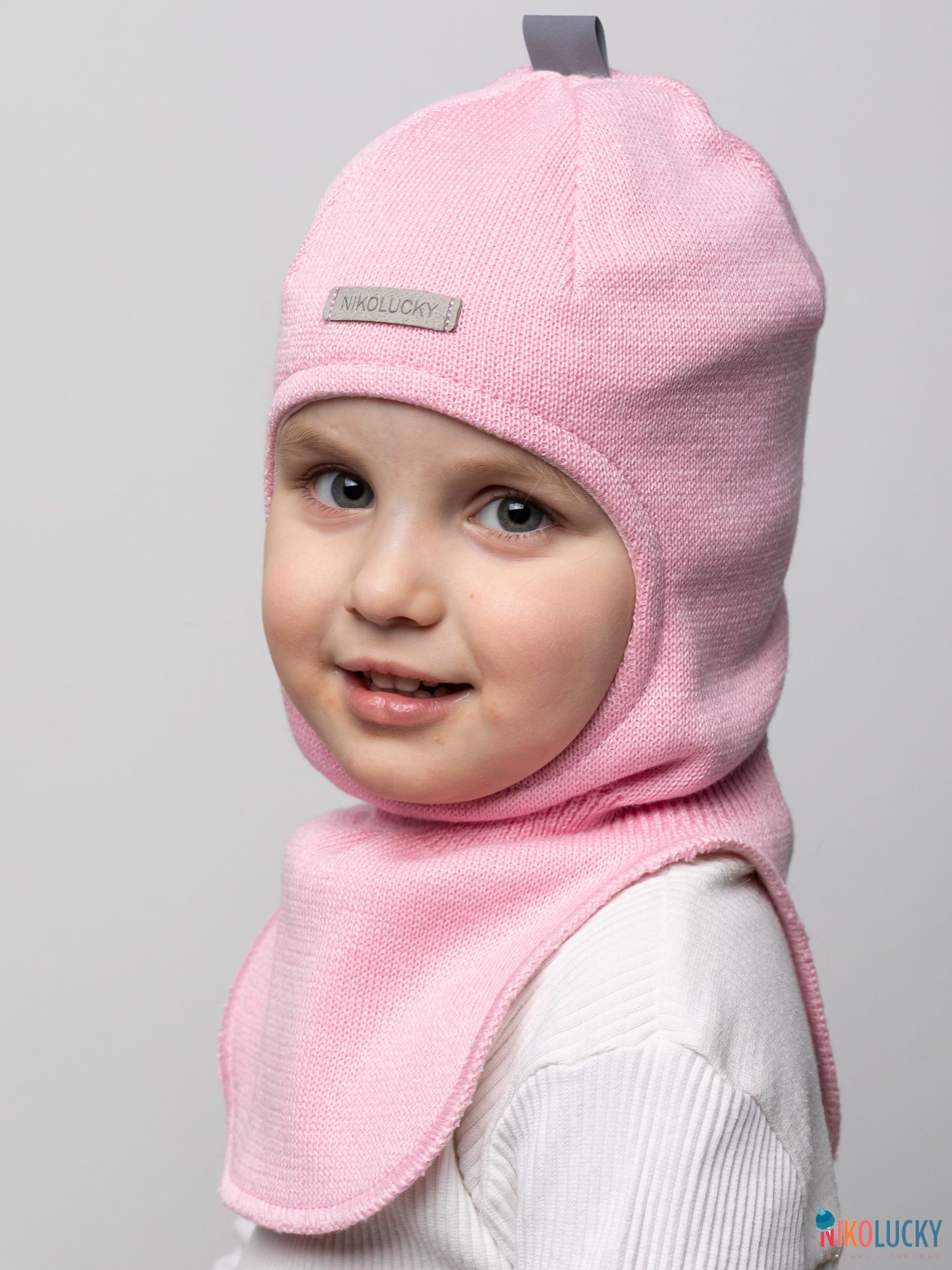 Головной убор для девочки украшает фирменная нашивка "NIKOLUCKY" из кожзама, а для дополнительной безопасности ребенка в темное время суток, сверху пришита светоотражающая тесьма.