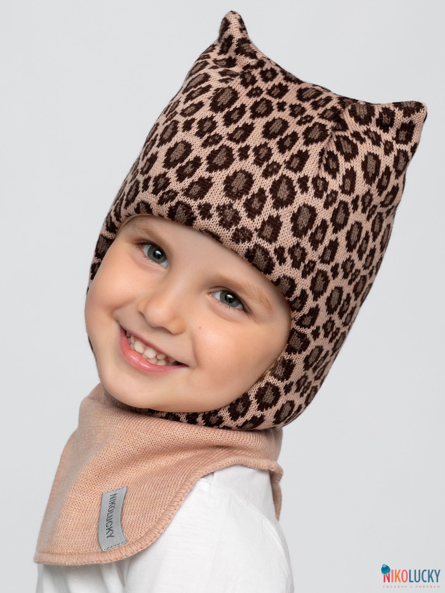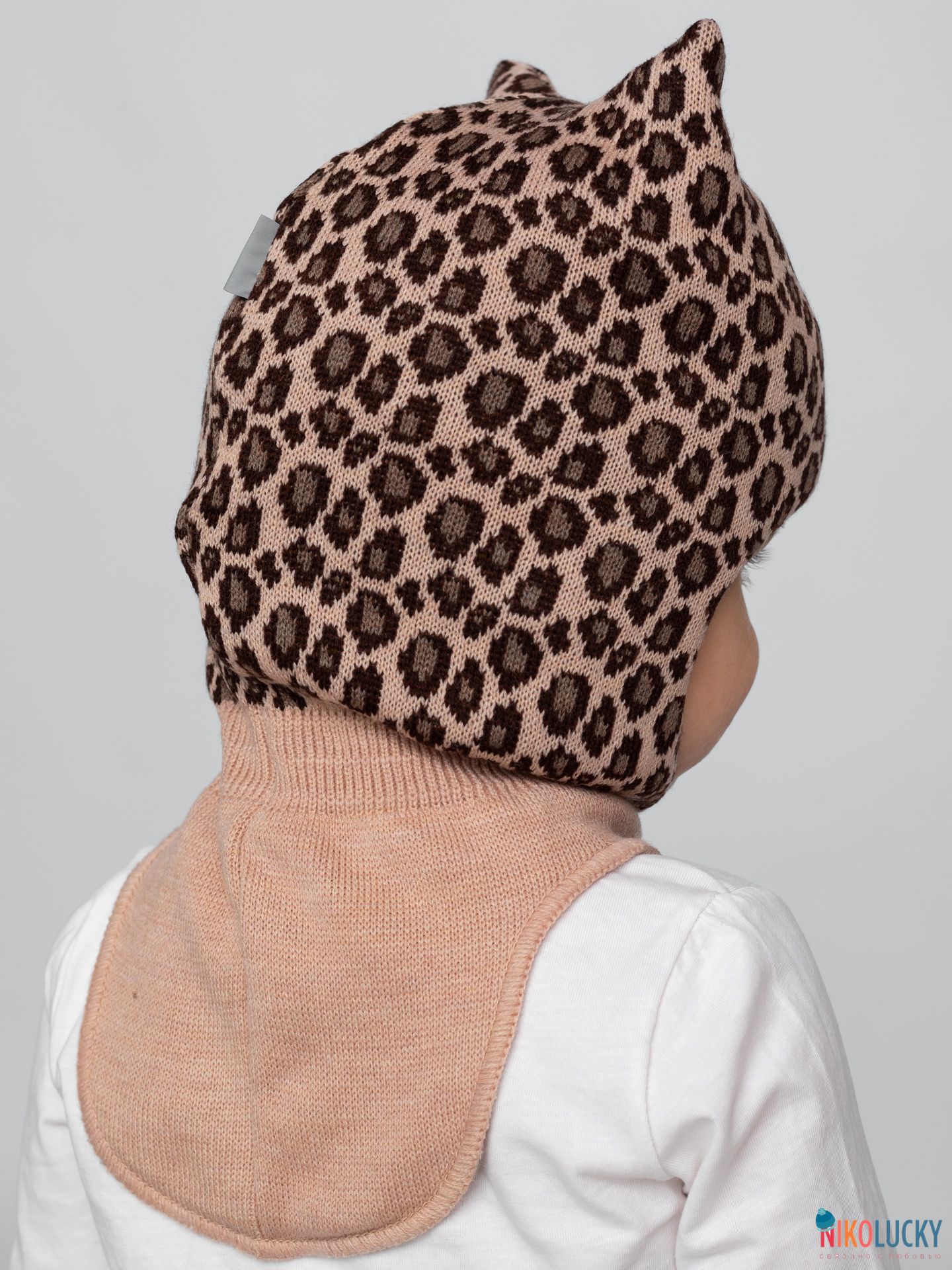 Верх связан модным рисунком под леопарда из пряжи с 50% содержанием шерсти мериноса, подклад-95% хлопок 5%лайкра, утеплитель-современный, легкий, дышащий и очень теплый синтепон Сиберия плотностью 150гр/м2, который идет по всей голове (кроме манишки).