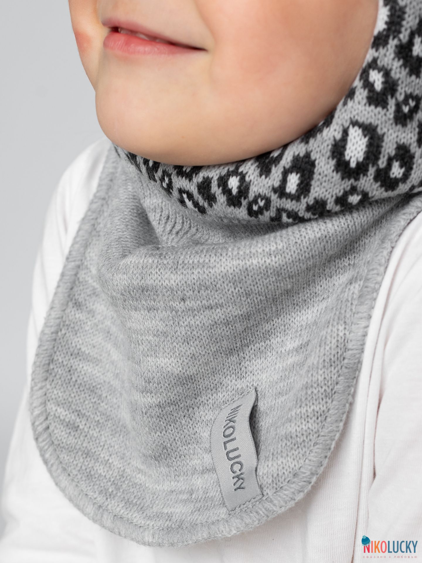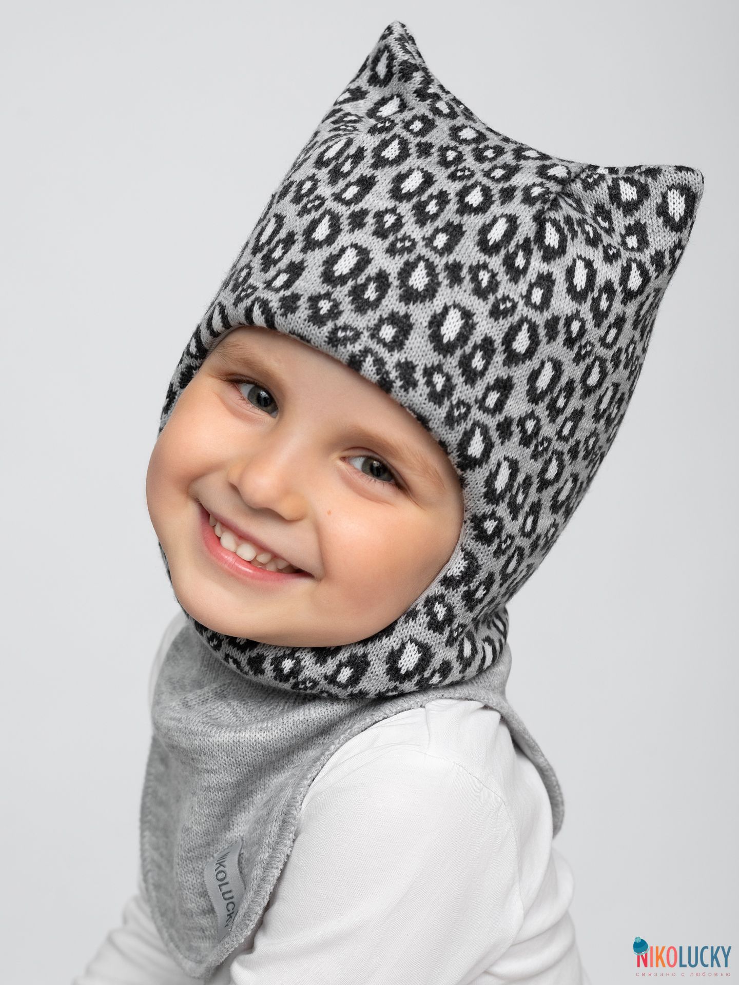 Верх связан модным рисунком под леопарда из пряжи с 50% содержанием шерсти мериноса, подклад-95% хлопок 5%лайкра, утеплитель-современный, легкий, дышащий и очень теплый синтепон Сиберия плотностью 150гр/м2, который идет по всей голове (кроме манишки).
