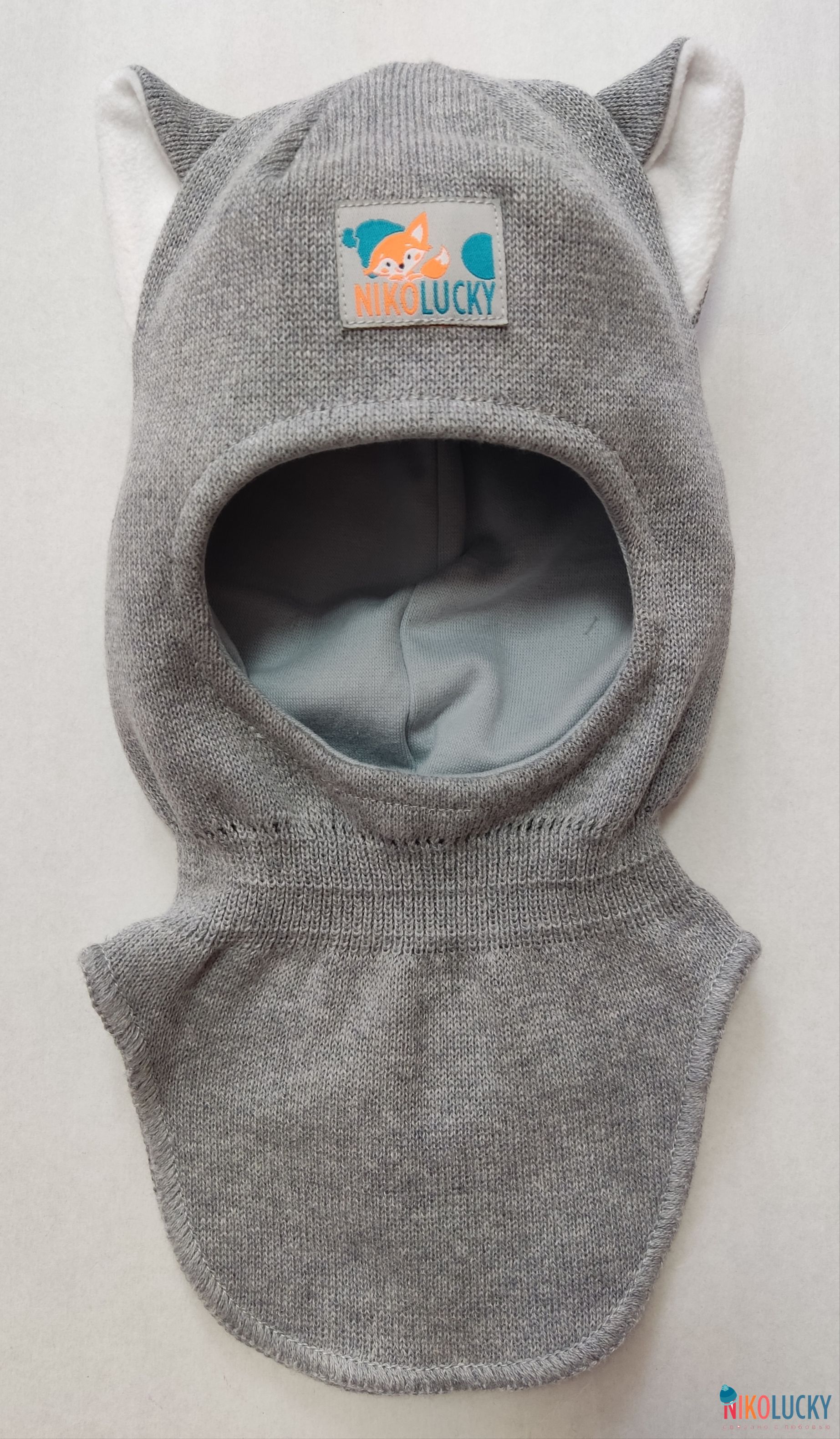 Головной убор украшен фирменной жаккардовой нашивкой "NIKOLUCKY" и забавными двухцветными ушками лисенка.