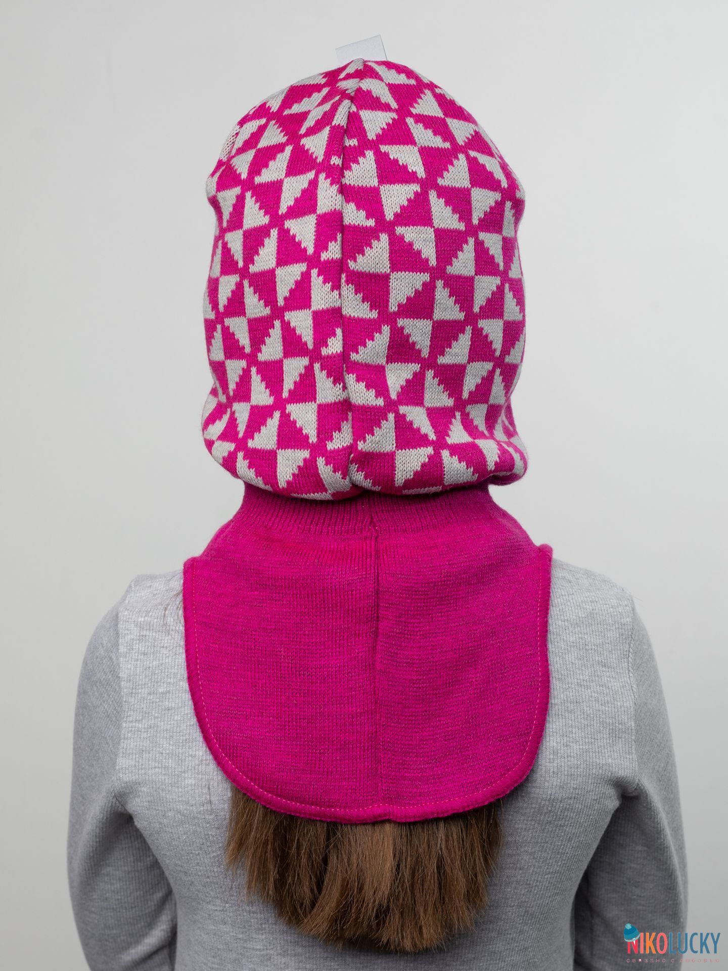 Шапка шлем для девочки демисезонный сезона осень-весна с цветным рисунком в виде бантиков. Головной убор для девочки связан из пряжи с 30% содержанием шерсти мериноса, а подкладка выполнена из трикотажного полотна с составом 95% хлопка 5% лайкры.