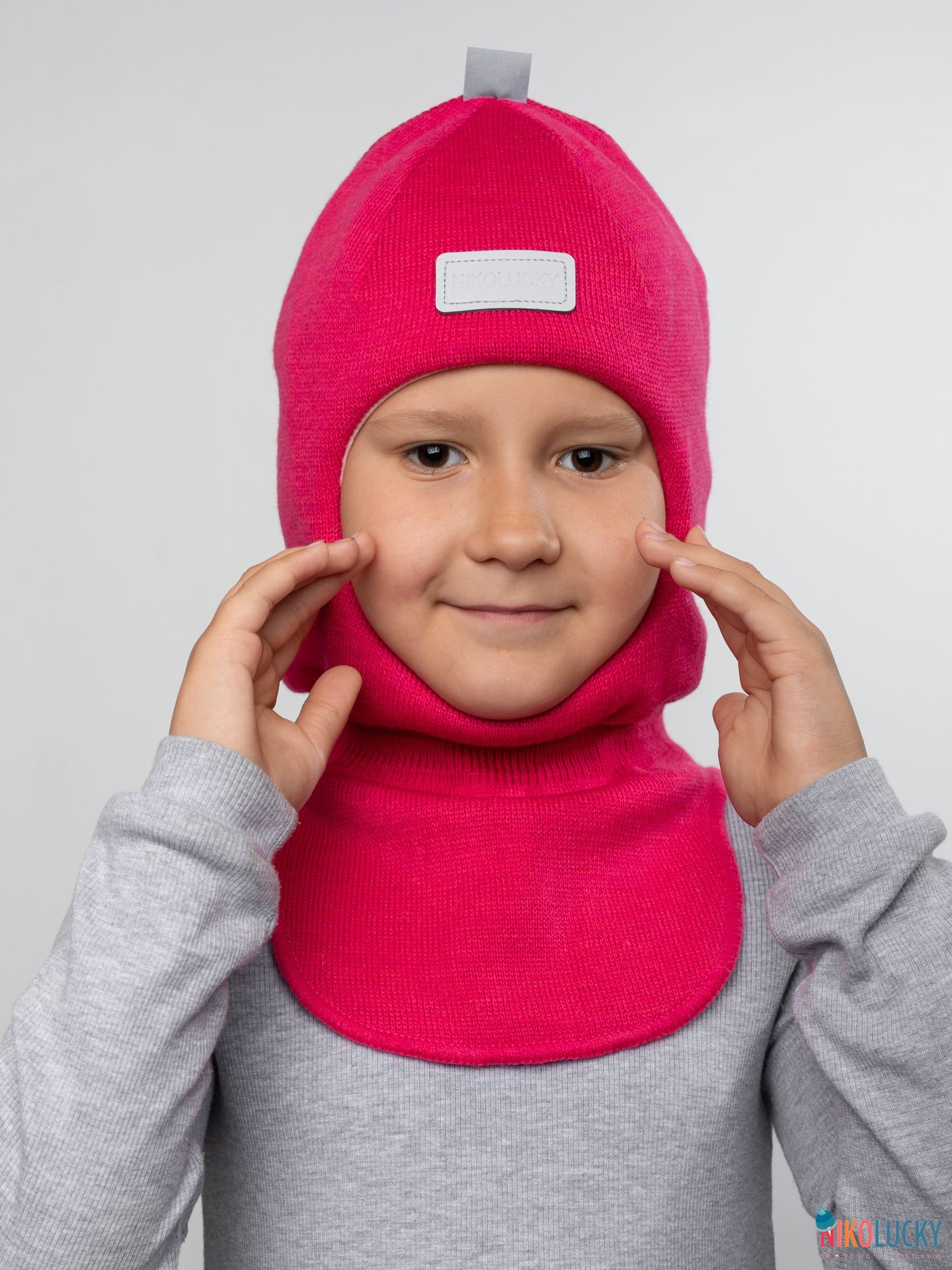 Шапка шлем детская украшена фирменной светоотражающей нашивкой NIKOLUCKY и тесьмой, которые обеспечат безопасность вашего ребенка в темное время суток.